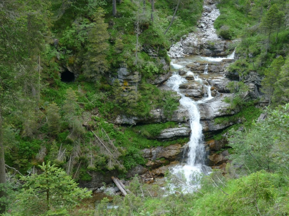 Percorriamo il sentiero, sempre abbastanza in quota, che cammina vicino al letto del Fiume Piave, alla sinistra della strada asfaltata, tra pietraie e zone di bosco leggero e in un paio di km arriviamo alla piccola ma accogliente Baita Rododendro a 1450 m da cui è possibile anche imboccare il sentiero che, attraverso il Pian delle Bombarde, porta ai laghi d’Olbe, piccoli laghi di origine glaciale, sorti alle pendici del monte Lastroni. Ma noi dobbiamo proseguire e, attraversato il ponticello dietro la Baita Rododendro, seguendo il segnavia di colore giallo, proseguiamo lungo il sentiero che ci mostra, più in giù, il paziente lavoro di erosione della roccia compiuto dalla forza incessante del Fiume Piave.