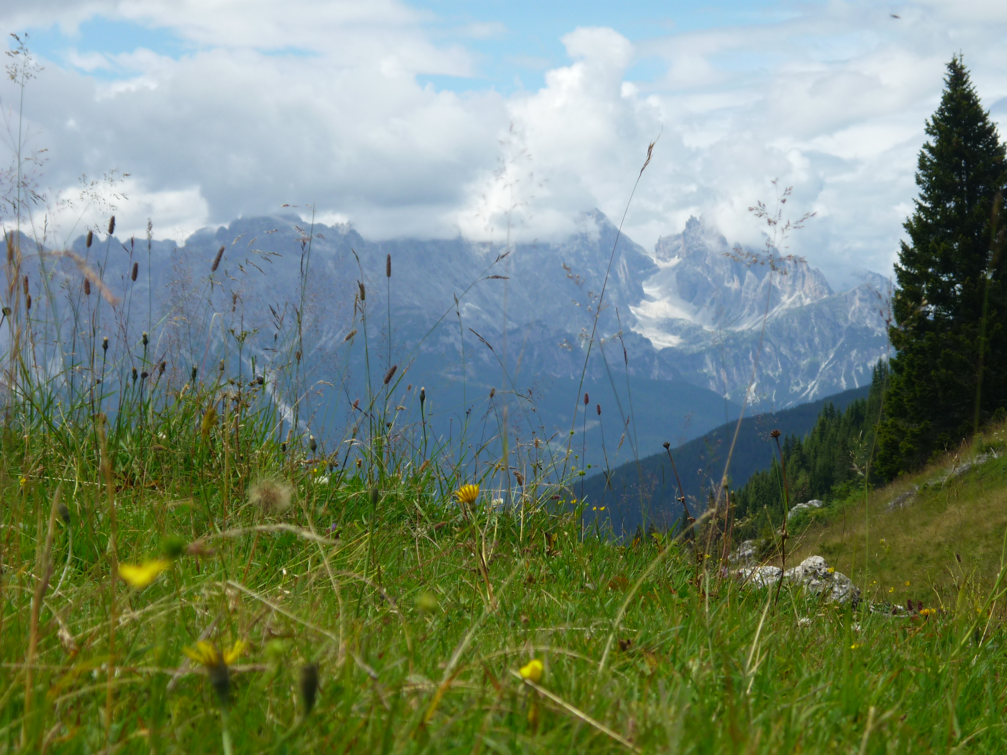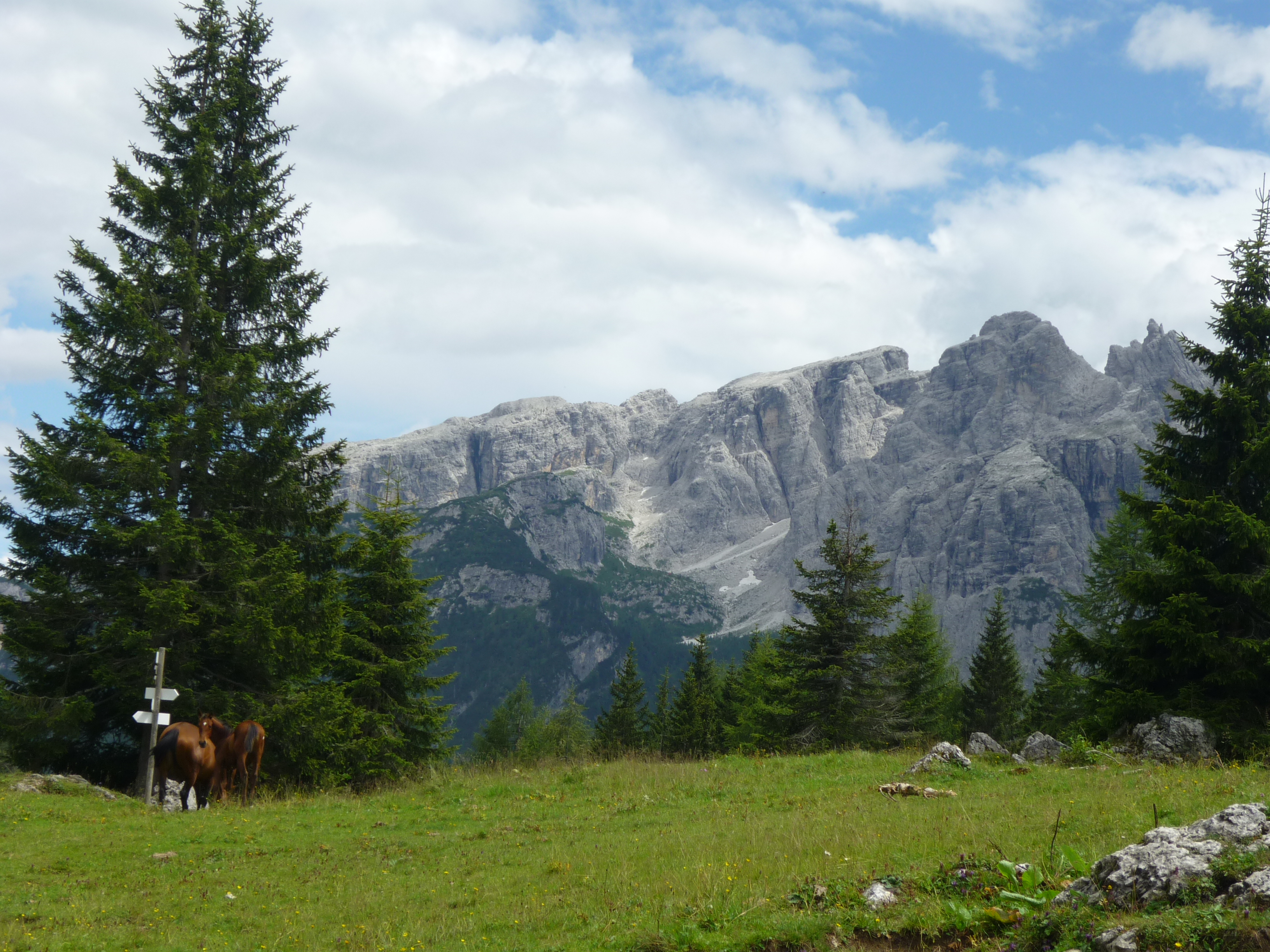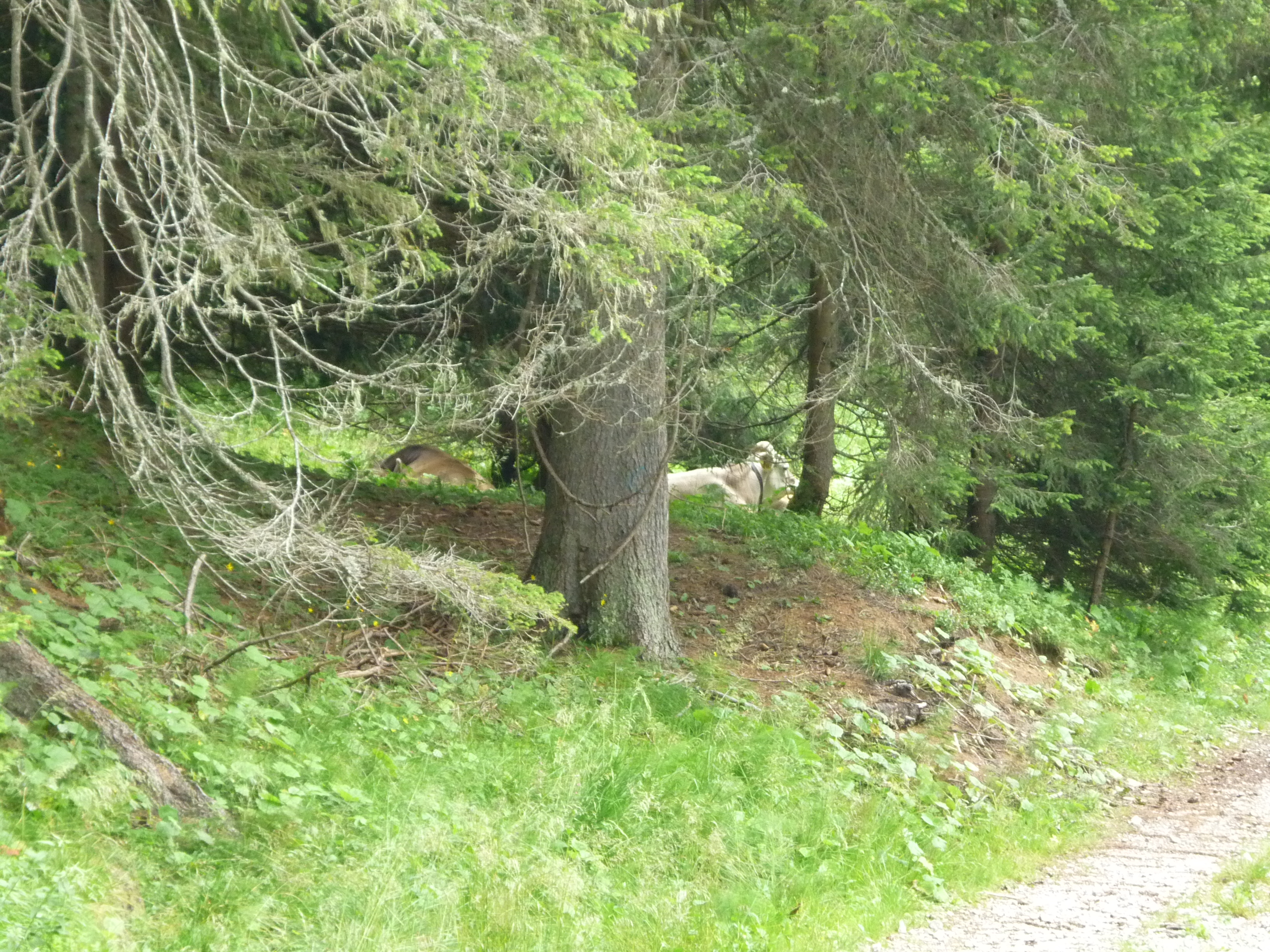 Da qui in avanti il dislivello inizia a diventare deciso e il bosco sempre più fitto e dopo mezz’ora di cammino incontriamo un segnavia che ci indica che siamo arrivati alle Paludi di Tamerle a 1400 m. Seguiamo quindi il sentiero CAI 309 sempre in direzione Passo Digola e, sempre in decisa salita, dal bosco ci accorgiamo che ci stiamo avvicinando al Monte Fiorito (2131 m) alla Croda Casara (2372 m) e alla Terza Media (2458 m), cosa questa, che ci fa capire che siamo in avvicinamento alla Casera Tamer di Dentro, infatti, a conferma di ciò, poco dopo, scorgiamo sotto il bosco un gruppo abbastanza numeroso di mucche che, distese all’ombra degli abeti riposano beatamente.