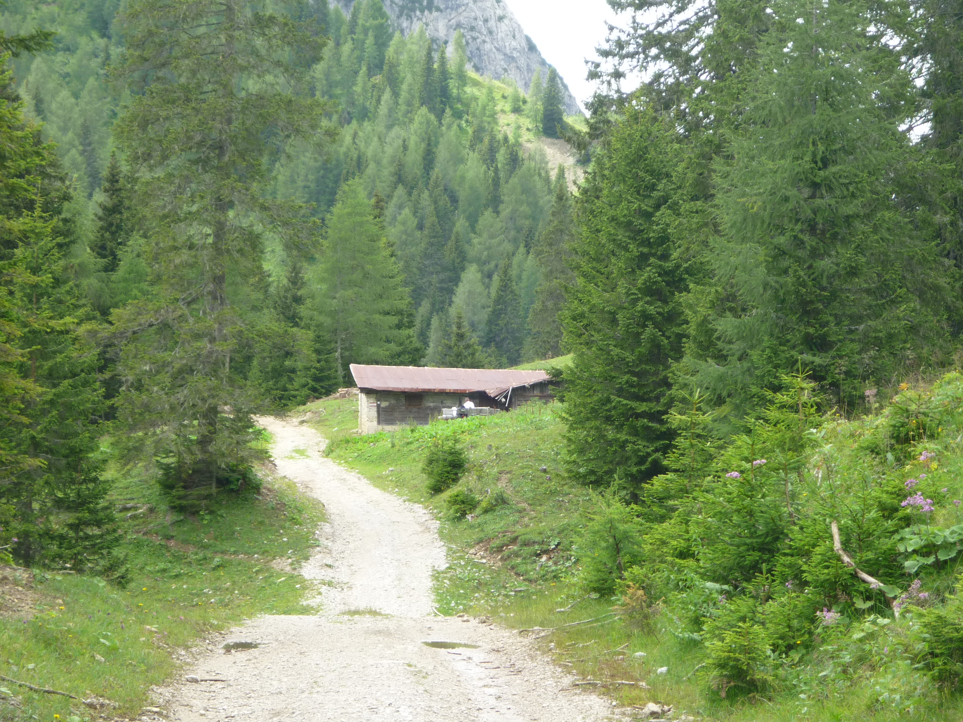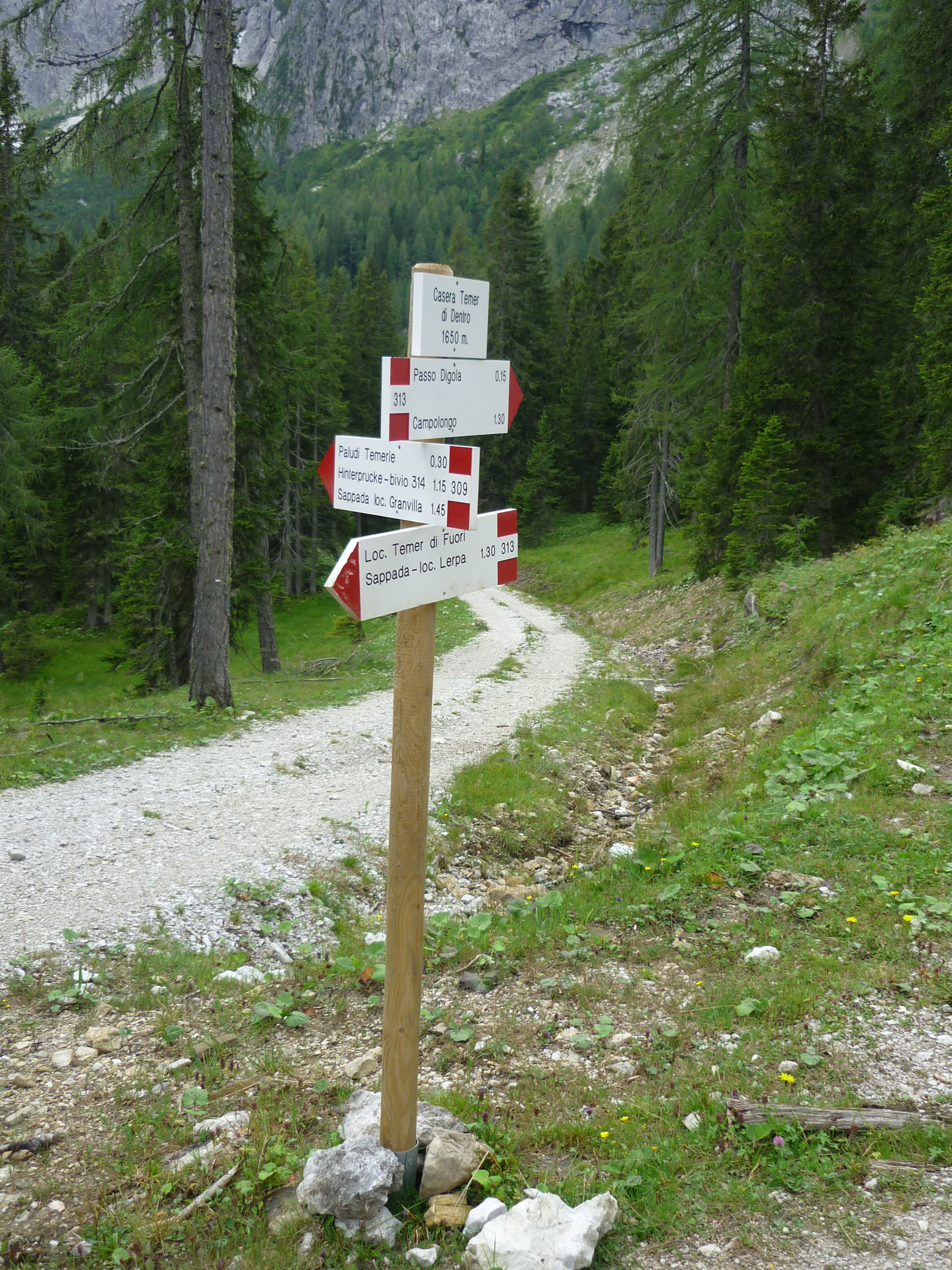 Dopo 5 km e quasi 2 ore di cammino, raggiungiamo il bivio, a 1650 m, che ci indica che siamo arrivati a Tamer di Dentro e infatti, dopo pochi passi, raggiungiamo la piccola Casera in disuso.