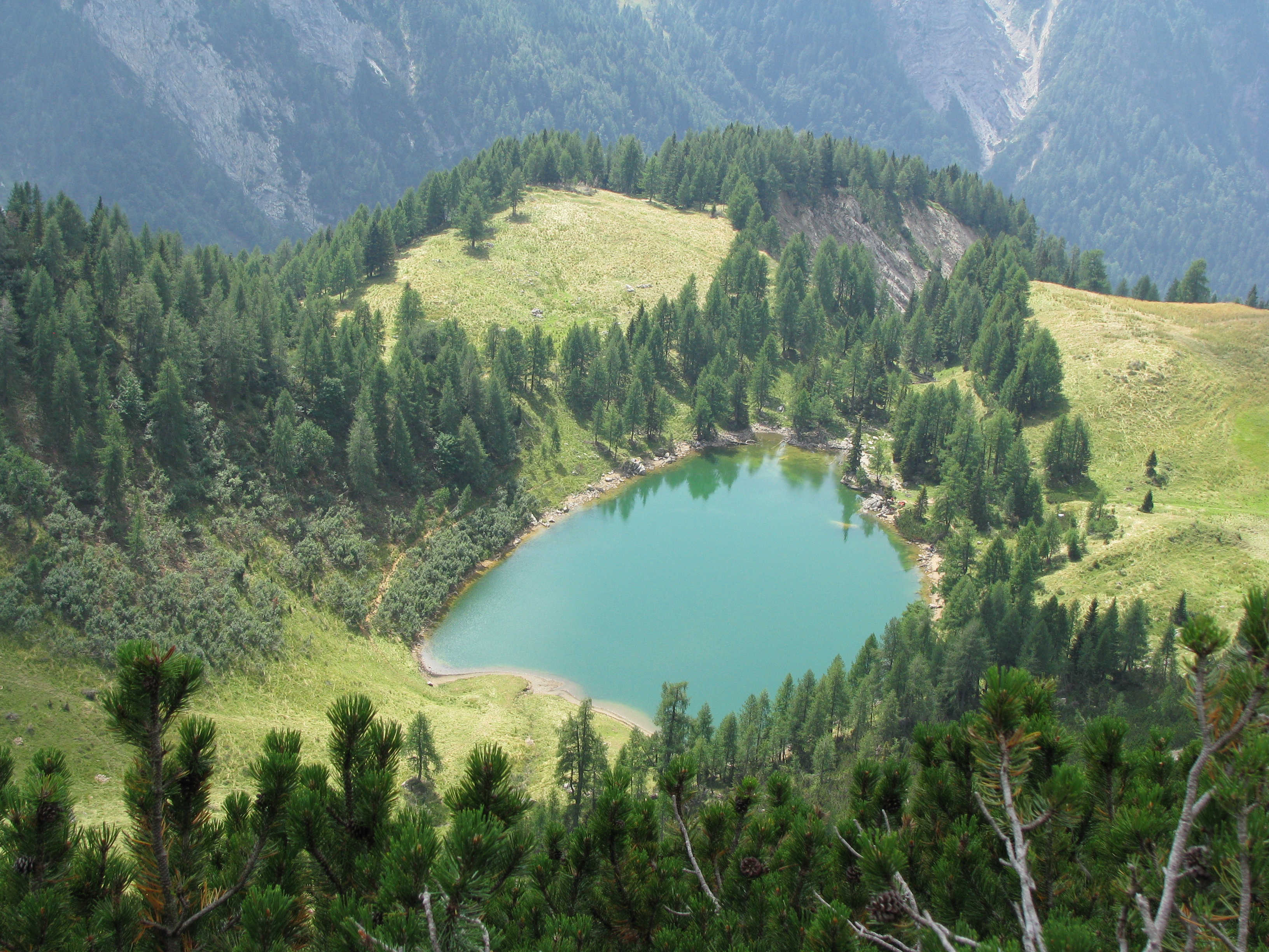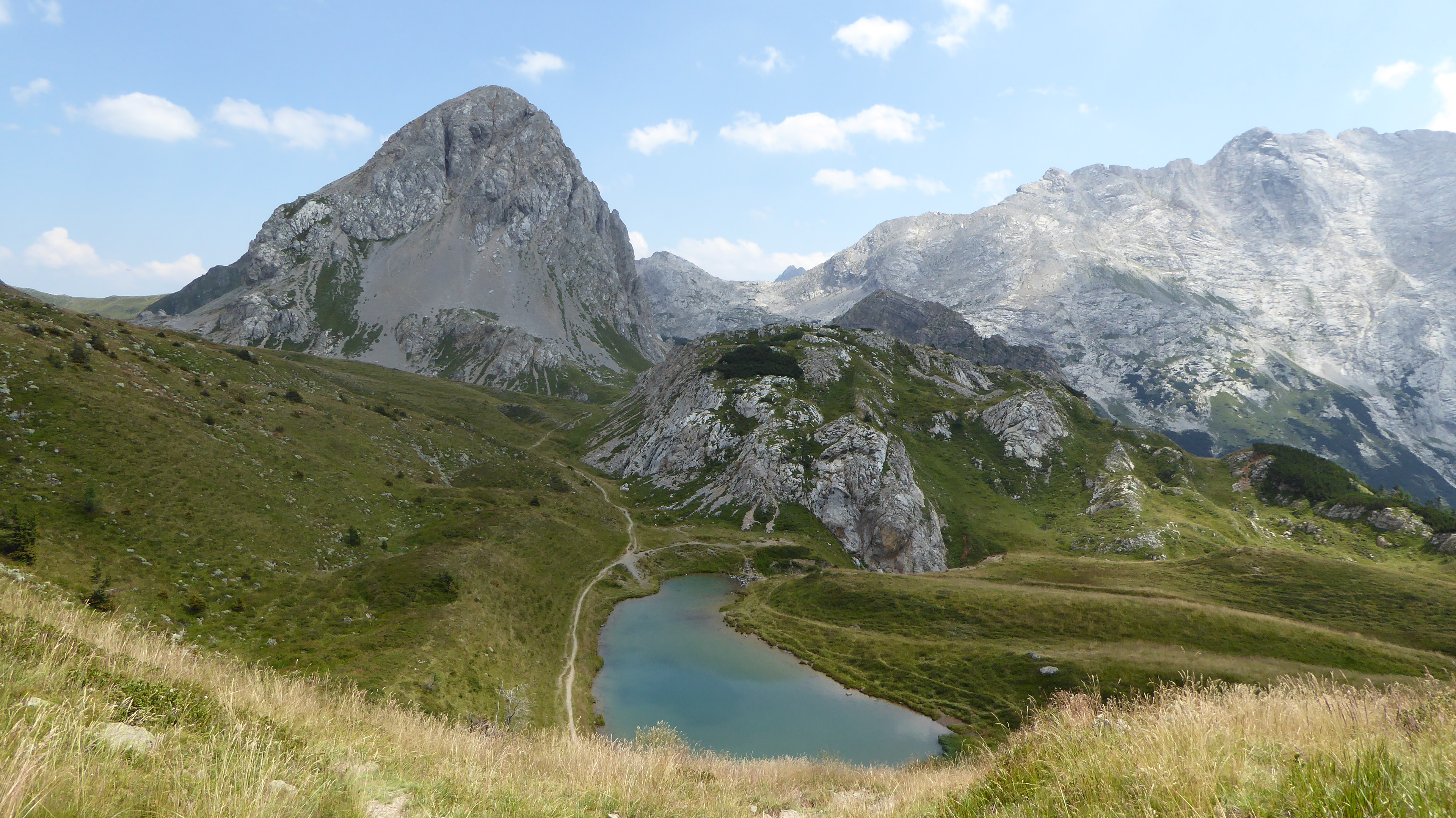 Ci rimettiamo in cammino e proseguiamo lungo la variante che in pochi minuti ci fa arrivare al passo Niedergailer (2003 m) da dove possiamo nuovamente riempirci gli occhi con una vista mozzafiato su tutta la Carinzia. Costeggiando dunque la Creta di Bordaglia, giungiamo ad un bivio: il sentiero 142a ci farebbe scendere di quota per raggiungere le bellissime sponde del laghetto Bordaglia, tutto circondato da pinetti e roccette, mentre il sentiero 142a-403 ci fa proseguire in quota su ghiaione sul versante Sud della Creta di Bordaglia; decidiamo di percorrere quest’ultima via e da qui possiamo ammirare dall’alto il lago Bordaglia e la sua conca incontaminata.