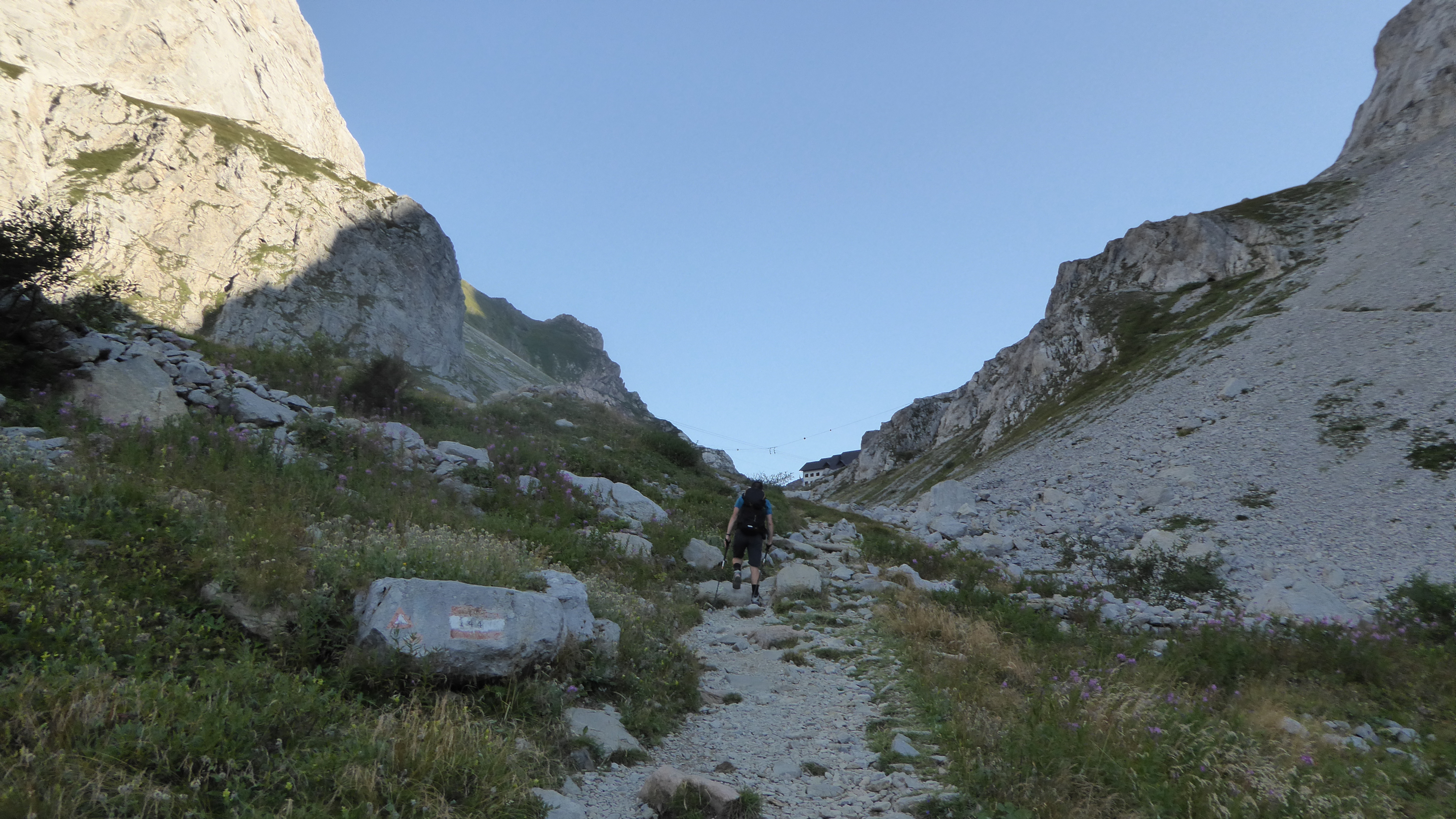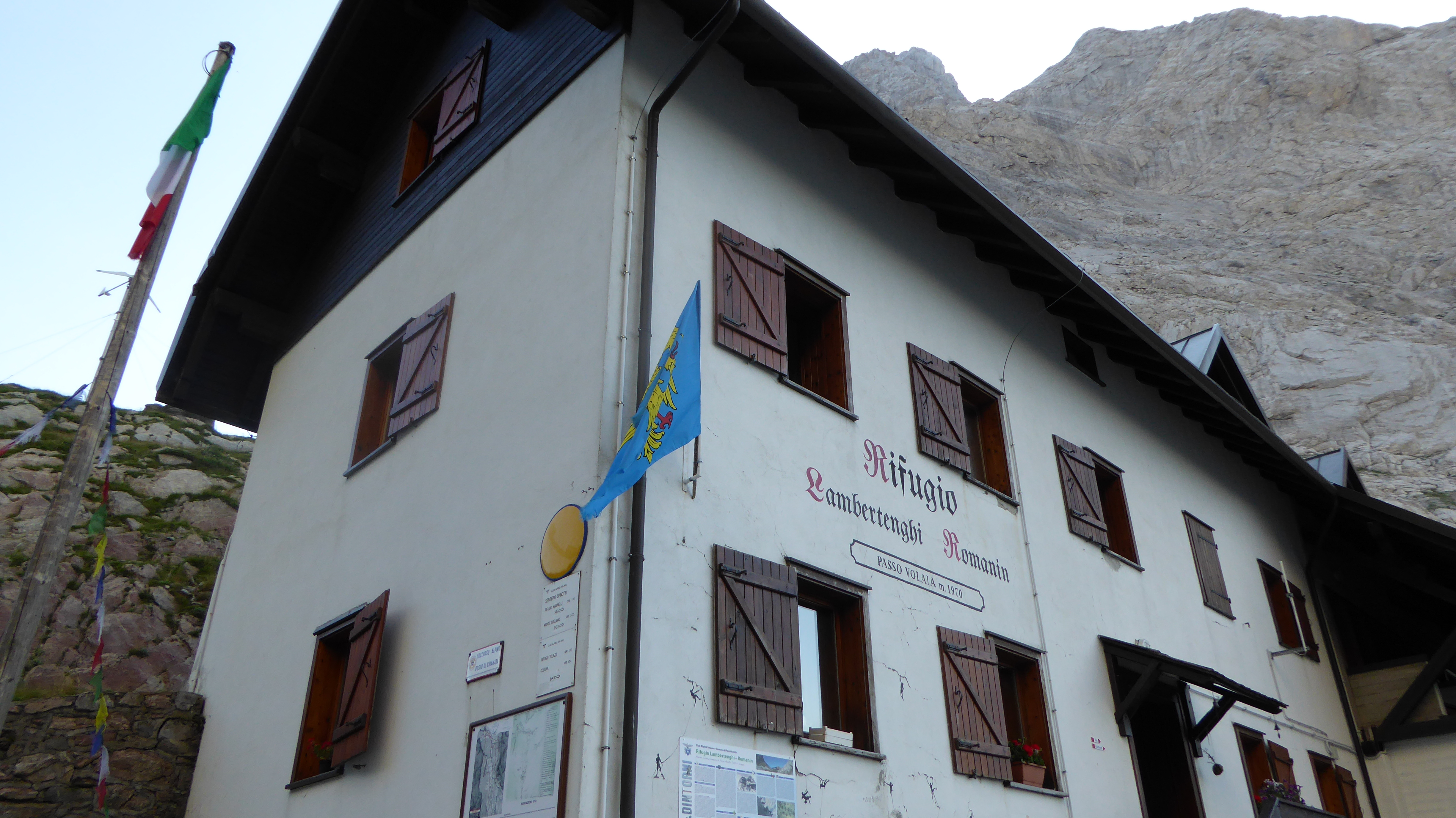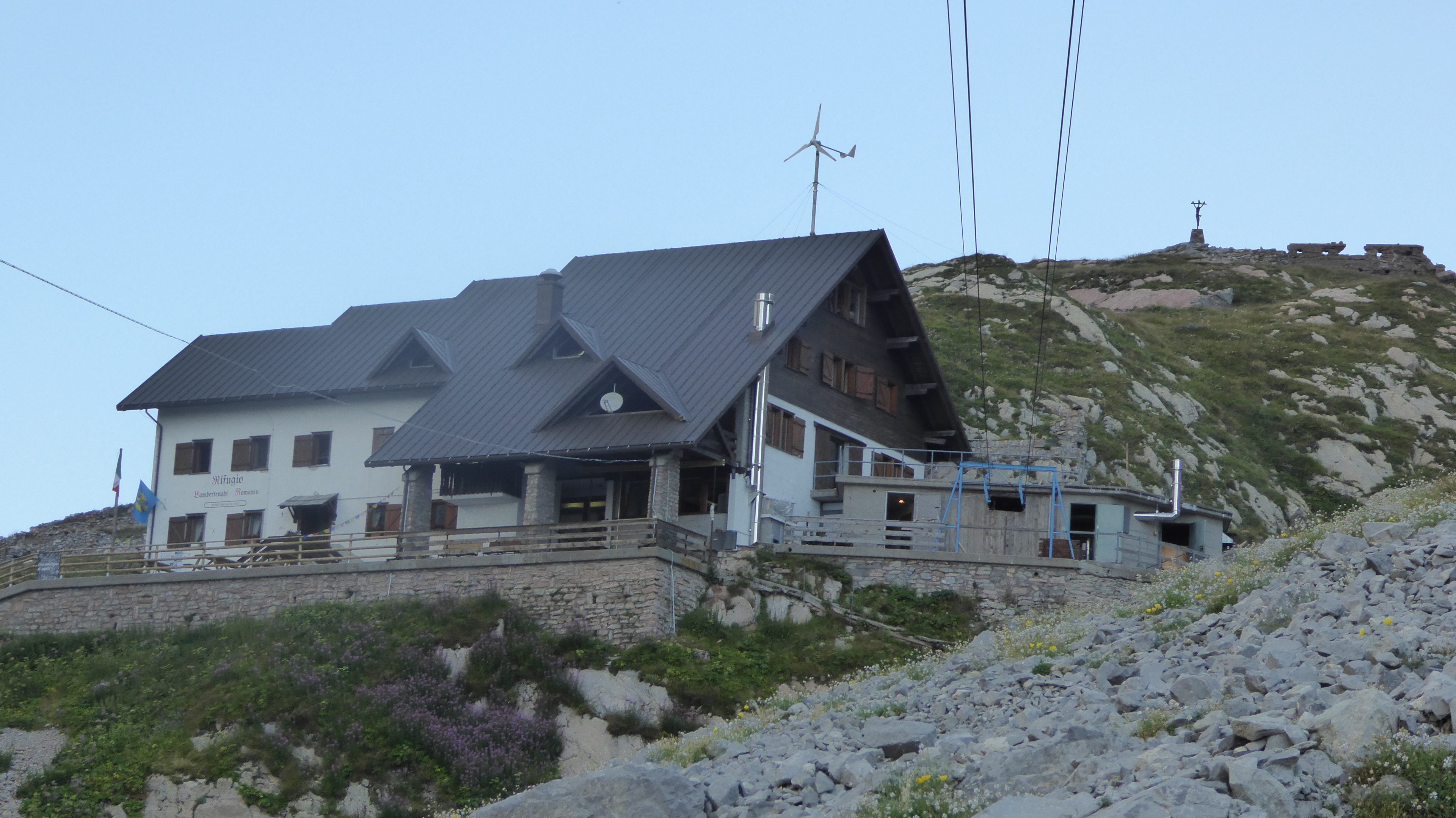 Continuando la nostra avanzata, raggiungiamo il bivio con il sentiero 145 che porta al rifugio Marinelli (2111 m) attraverso il famoso sentiero attrezzato Spinotti, ma noi dobbiamo proseguire e di lì a poco iniziamo ad intravedere, raggiunto dalla funicolare che ci ha accompagnato per tutto il tragitto, il rifugio Lambertenghi – Romanin (1955 m).
