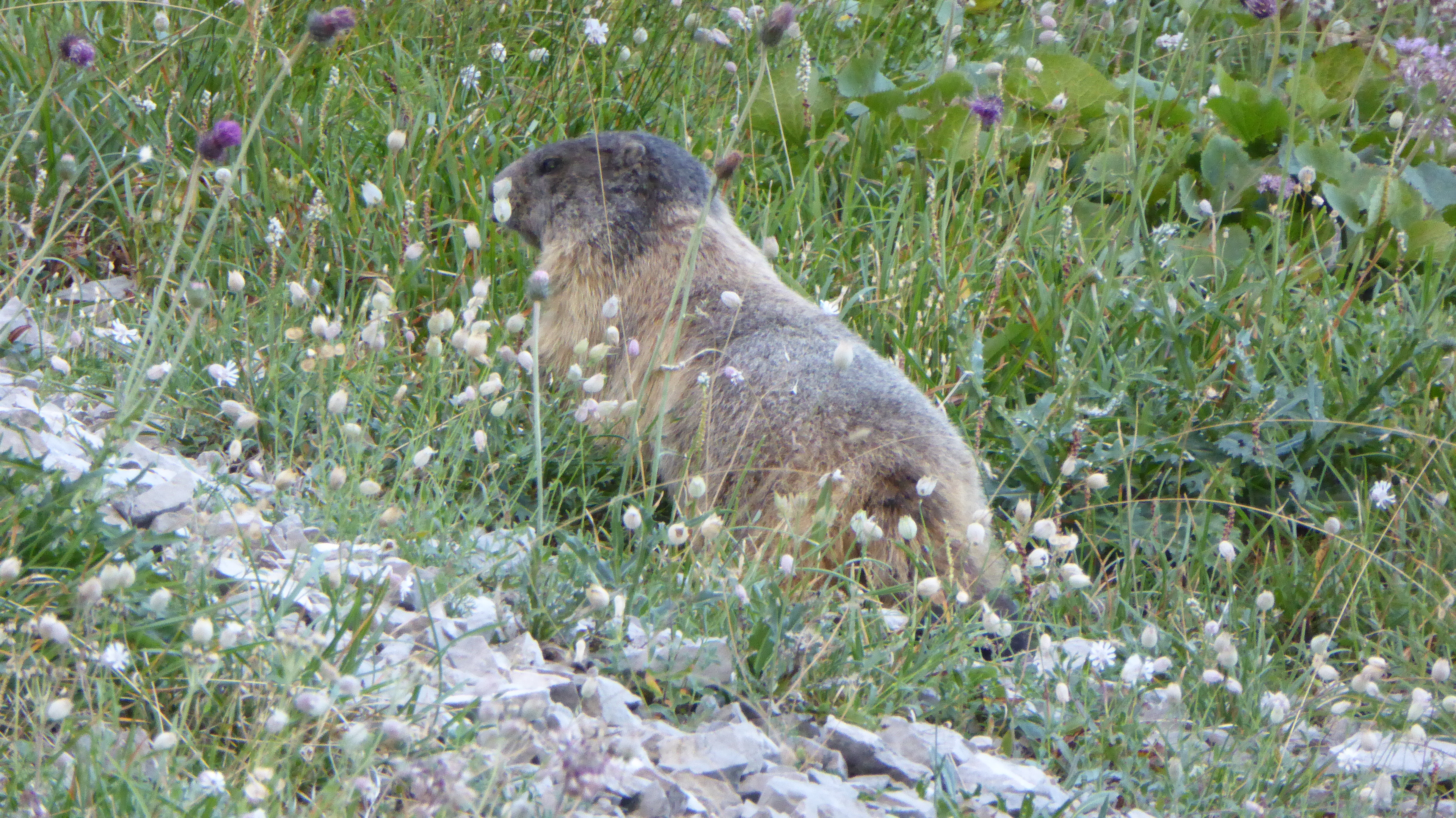 Poco prima di raggiungerlo, ecco che sulla destra del sentiero, una simpatica marmotta per niente impaurita, non esita a farsi avvicinare dagli escursionisti per farsi fare qualche foto e anche noi non perdiamo l’occasione per immortalare questa cosa più unica che rara.