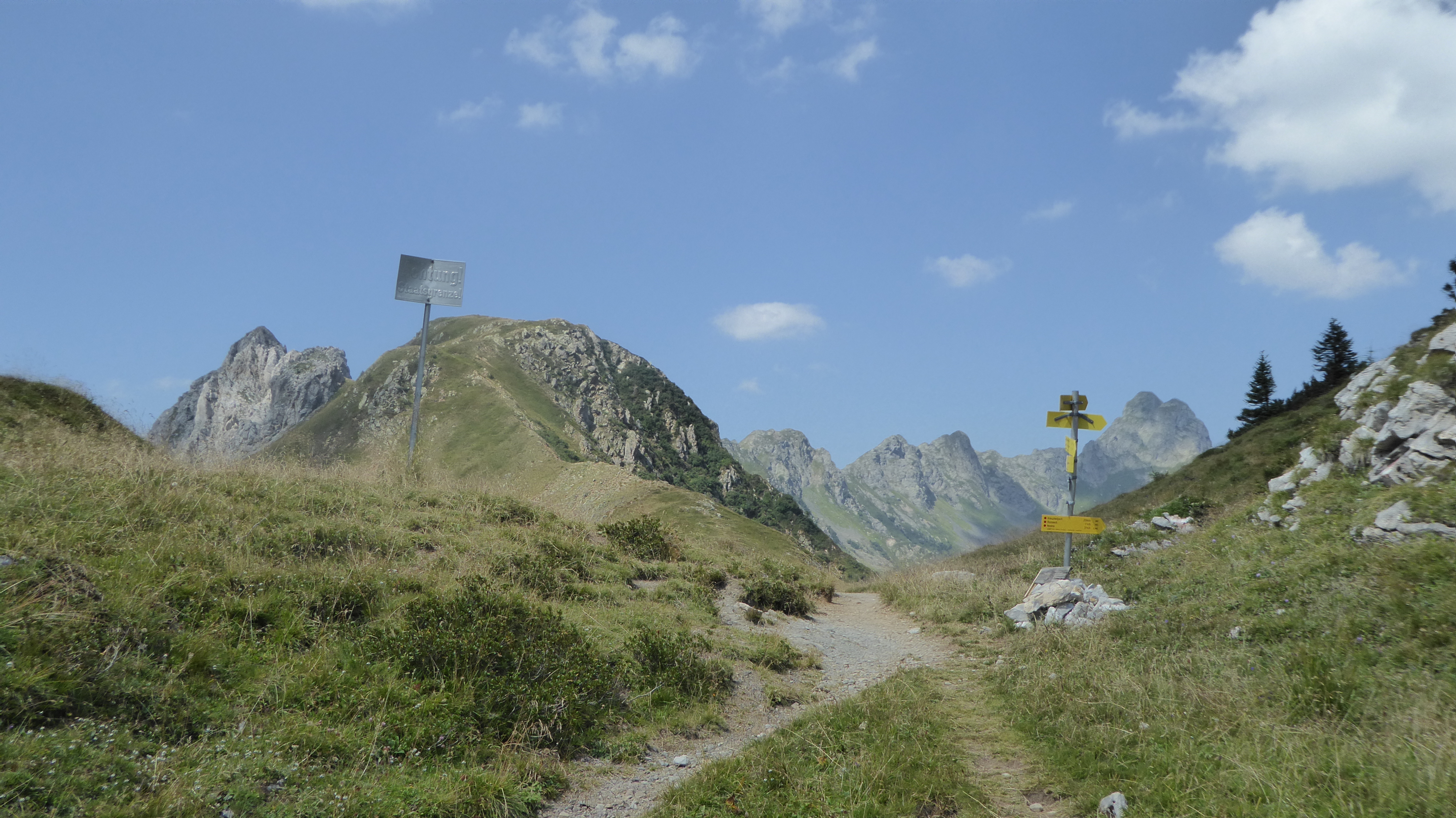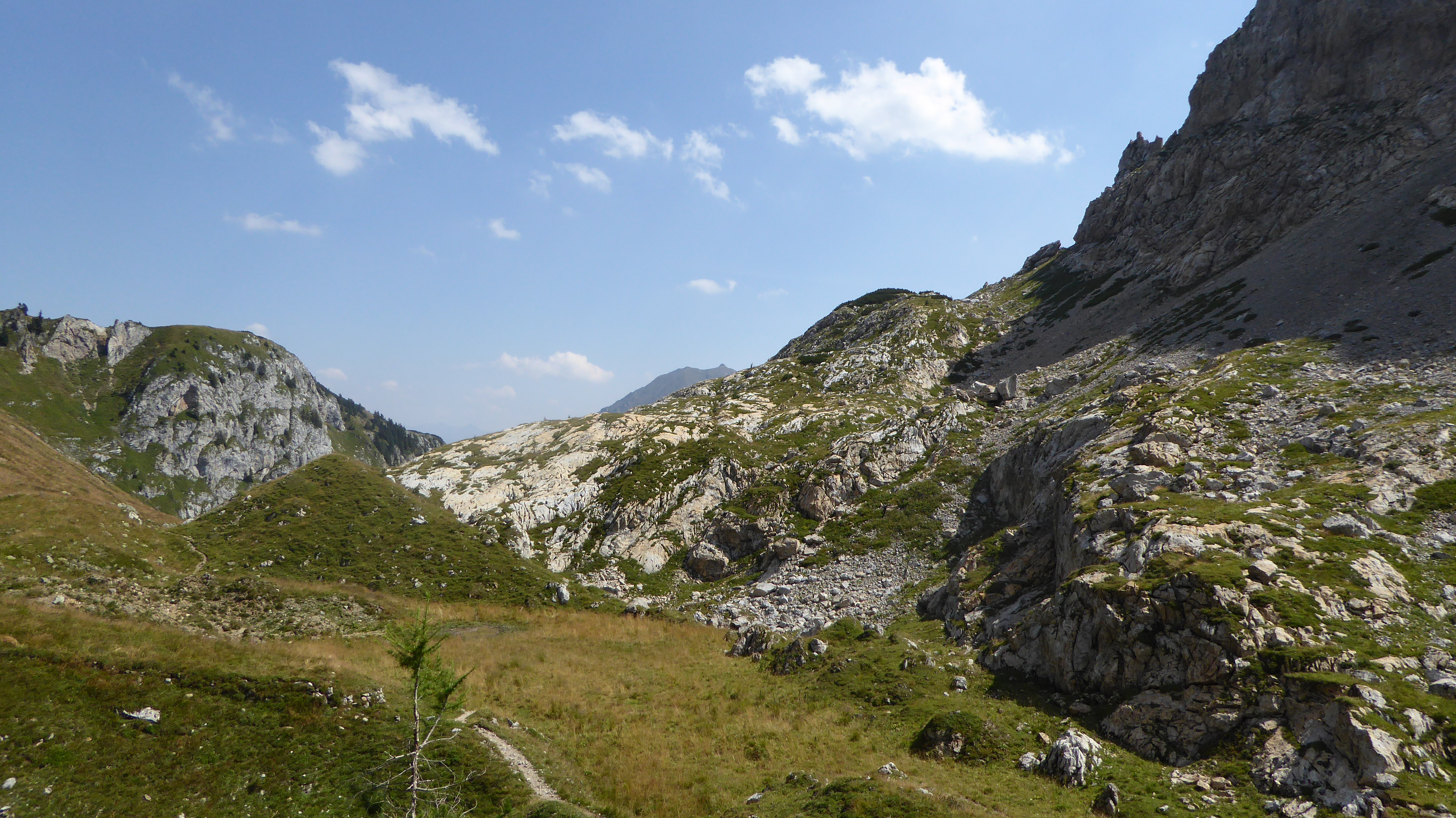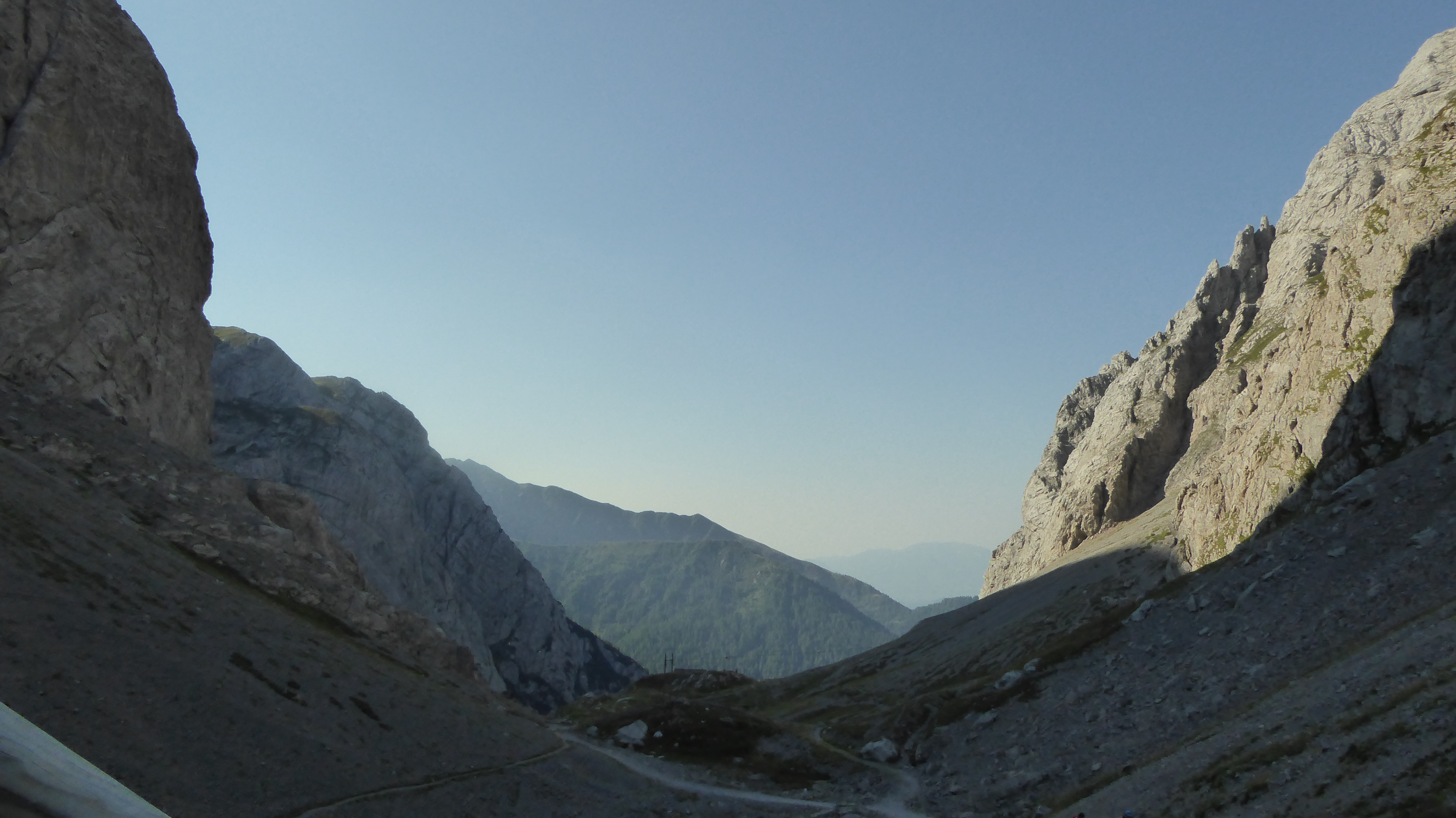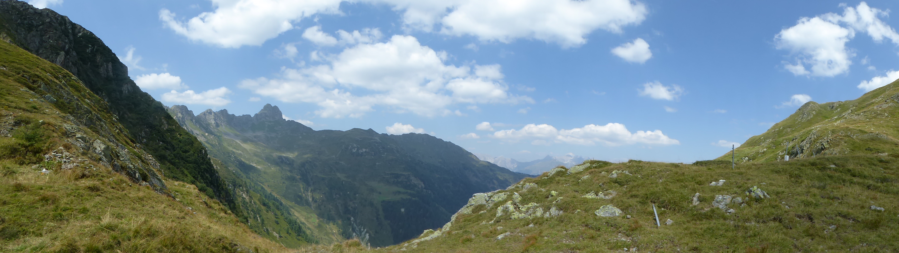 Il sentiero da subito affronta l’importante pendenza con qualche zig-zag stretto, lungo il muro da cui scende il torrente Lahner. Percorriamo questo km di sentiero in quasi un’ora, sotto il sole cocente e con tratti che raggiungono anche il 48% di pendenza, mai periocolosi se percorsi con fondo asciutto, fino a che il paesaggio ritorna ad essere nuovamente più amichevole. Da qui, attraverso belle roccette e massi che costeggiano il sentiero, raggiungiamo finalmente il Passo Giramondo che ci riconduce in territorio italiano e decidiamo di fermarci per una meritata pausa e gustare il nostro pranzo al sacco.