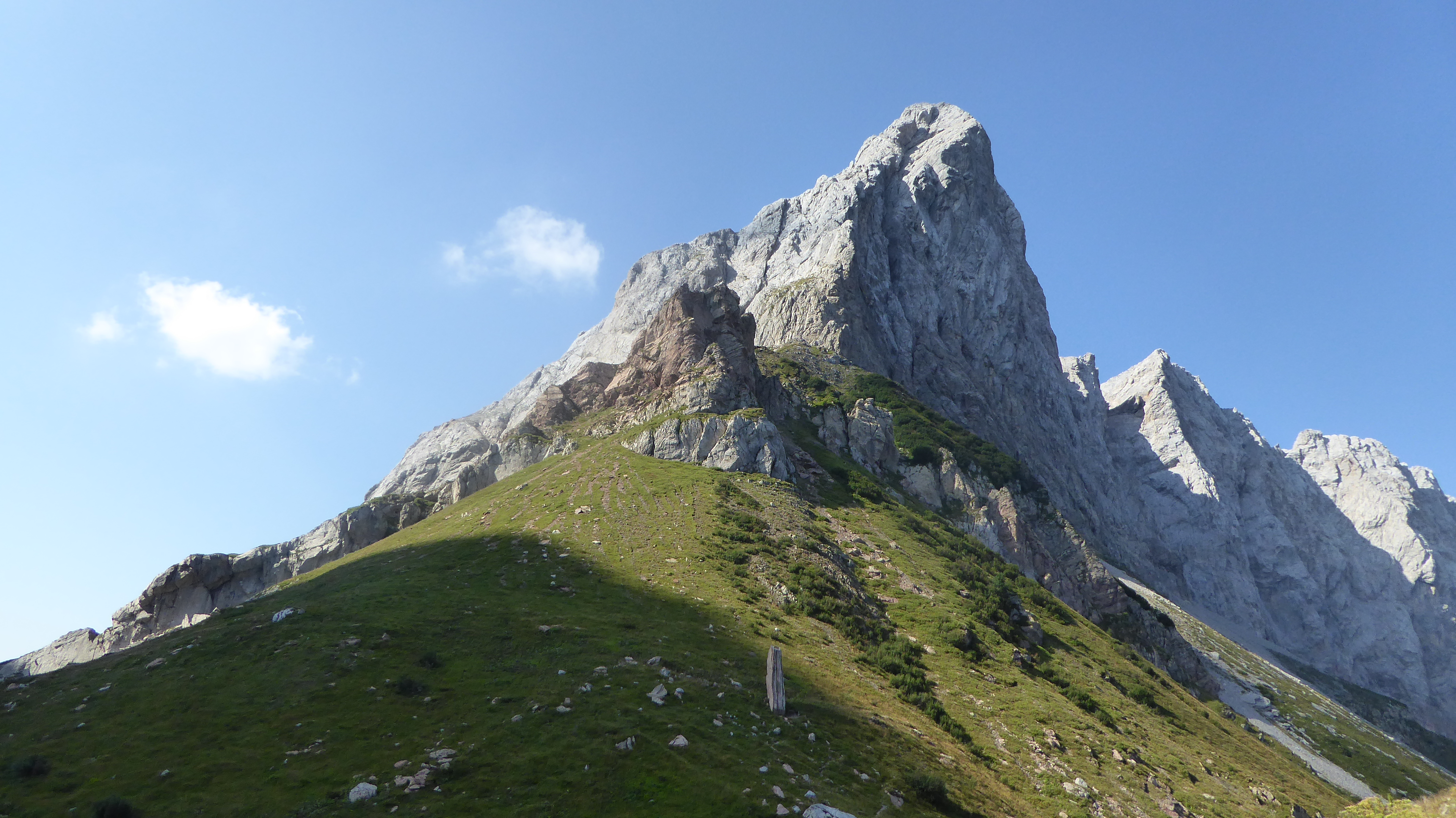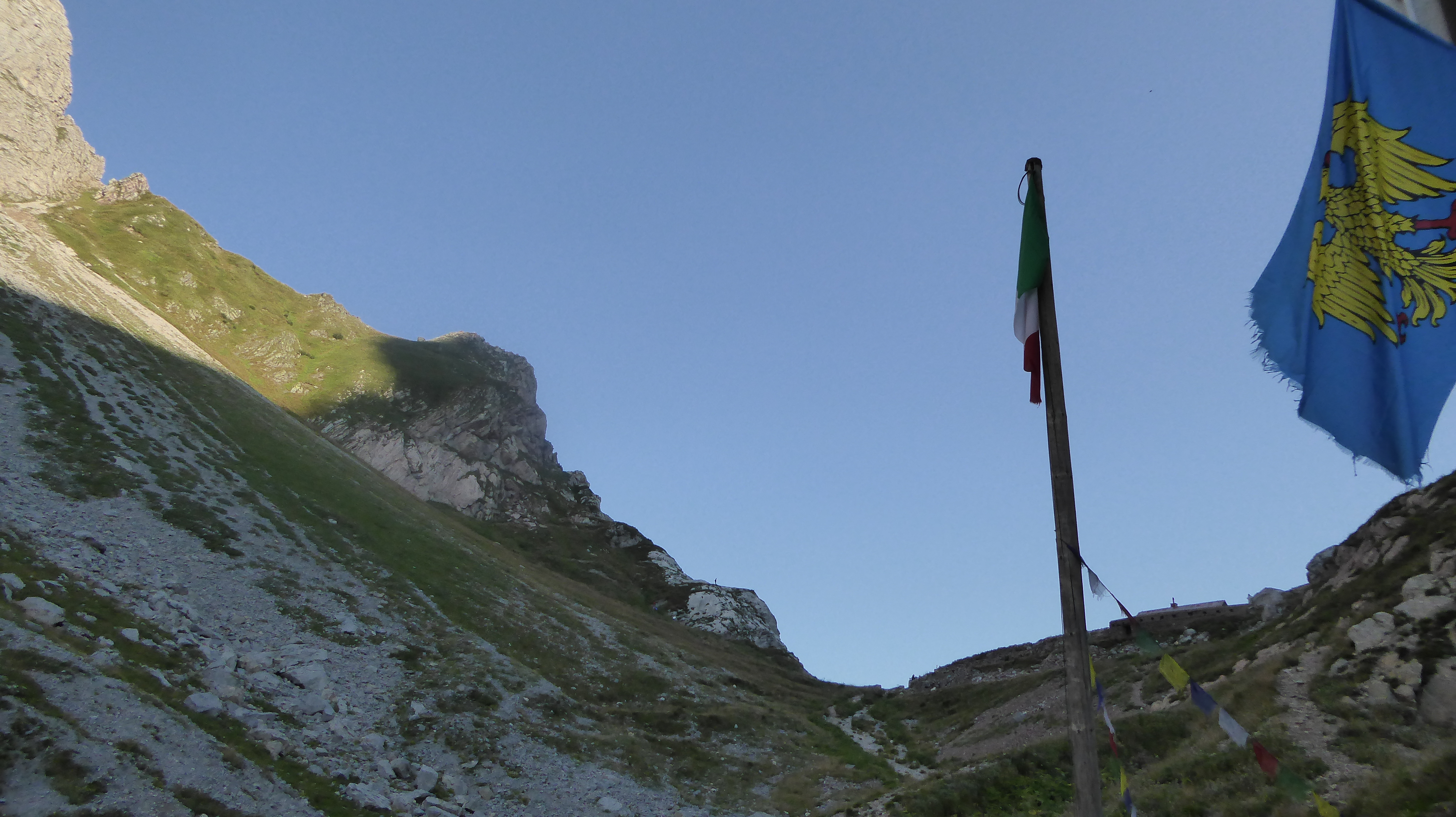 Il nostro primo obiettivo è il lago Volaia, oltre il passo omonimo, che possiamo vedere ancora 30 m più in alto, con i suoi muretti di confine, capanne abbandonate ed una croce in ricordo di tutte quelle vite spezzate e sacrificate per donarci la terra su cui stiamo camminando.
