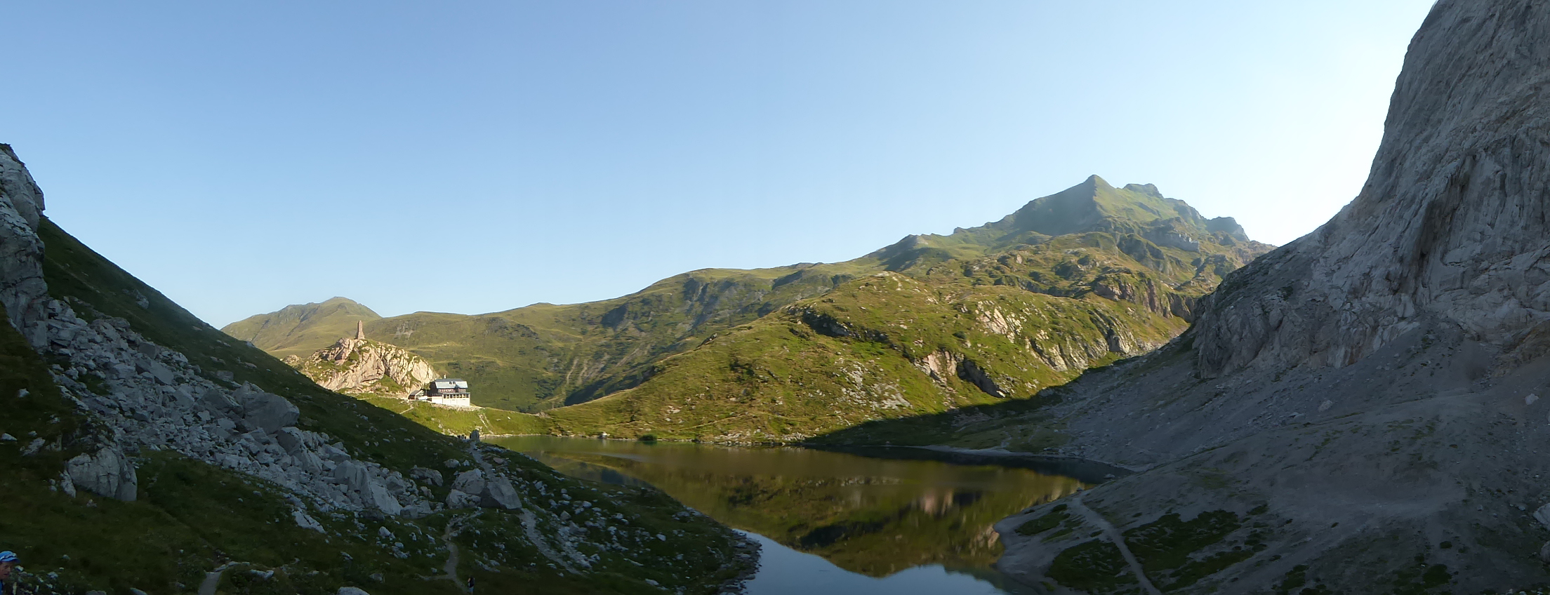 Con un bello sprint raggiungiamo il passo in brevissimo tempo, ed ecco che la luce del Sole inizia a filtrare da dietro le pareti del Monte Coglians e inizia a far brillare le acque tranquille del lago Volaia e con esso, tutta la conca di origine glaciale che lo circonda e il rifugio Wolayerseehutte a 1967 m, sul versante Nord, si risveglia.