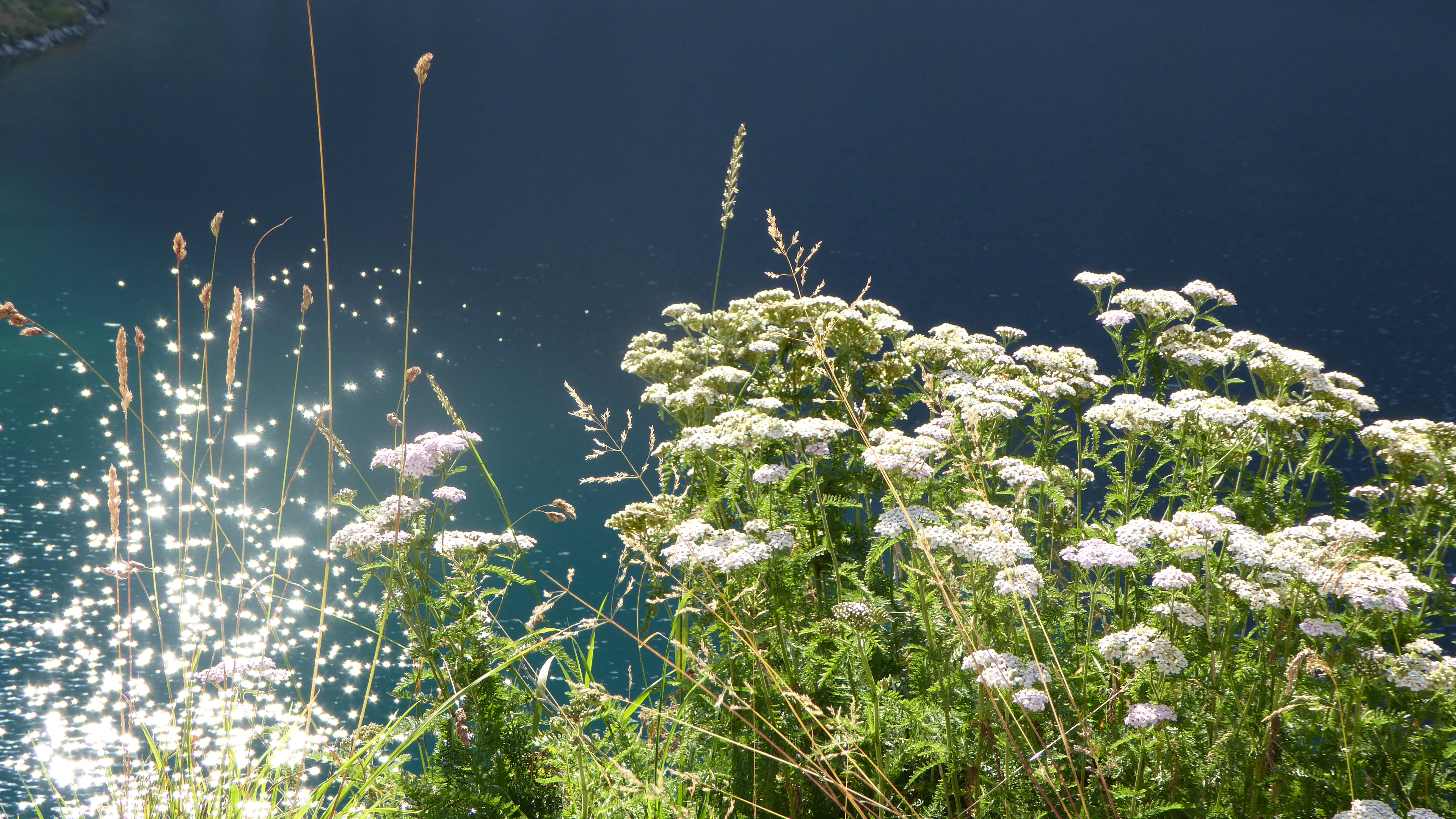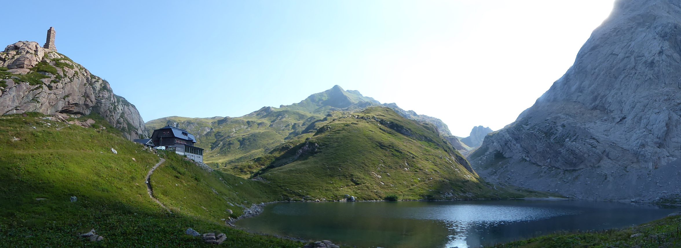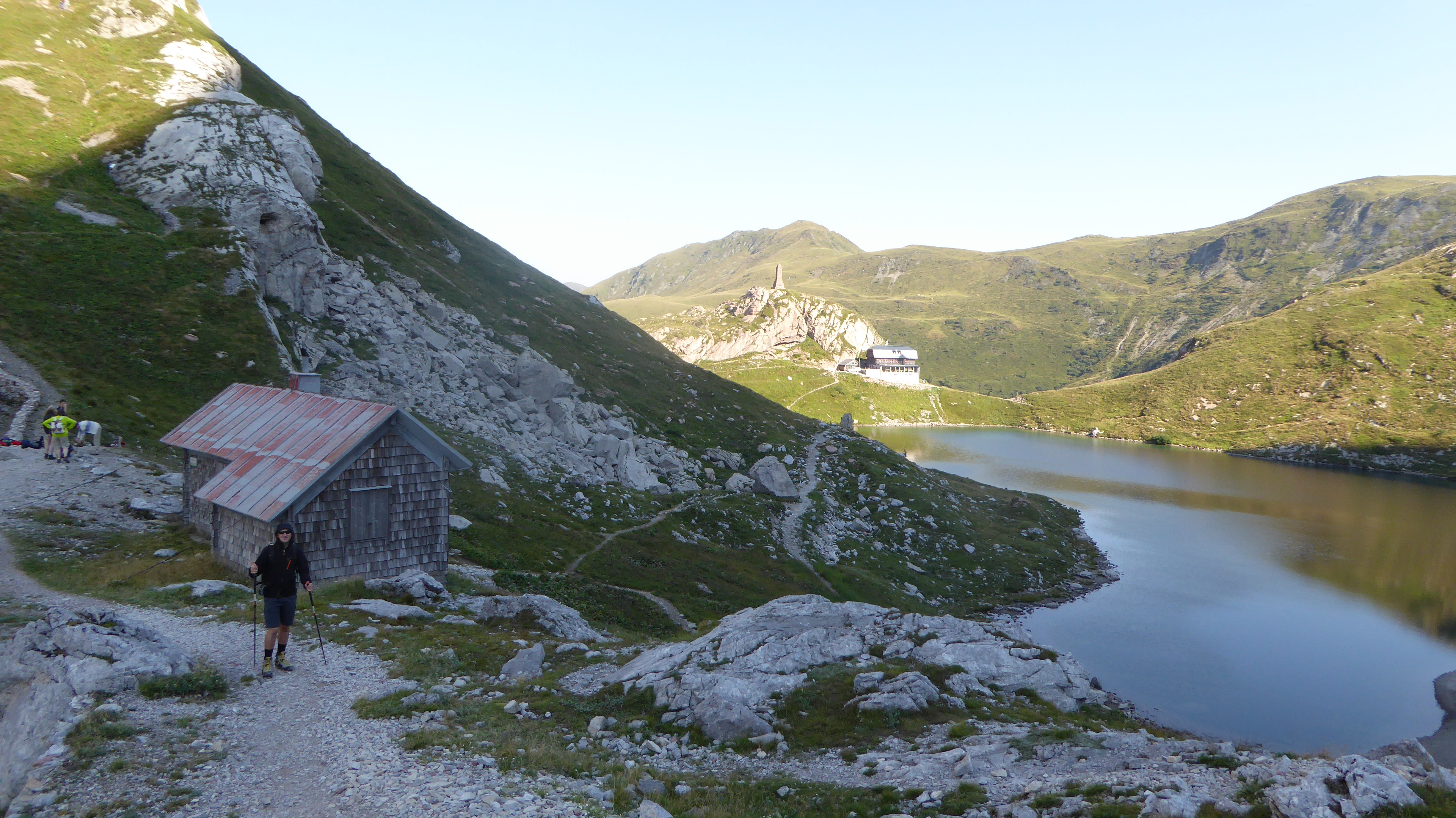 Dopo le foto di rito, scendiamo dal passo in terra austriaca verso il lago e costeggiandolo a Ovest, accarezzati dai tipici venti del passo Volaia, raggiungiamo il rifugio austriaco. Anche qui ci fermiamo pochi minuti per rifocillarci con una bevanda fresca e per ammirare il paesaggio da questo versante del lago: la luce che filtra dal passo Valentin a Est avvolge il maestoso Monte Coglians (2780 m) e il Lastron del lago (2595 m) per poi infrangersi sul Monte Capolago (2554 m) per farlo risplendere di un bel bianco che ci lascia a bocca aperta.