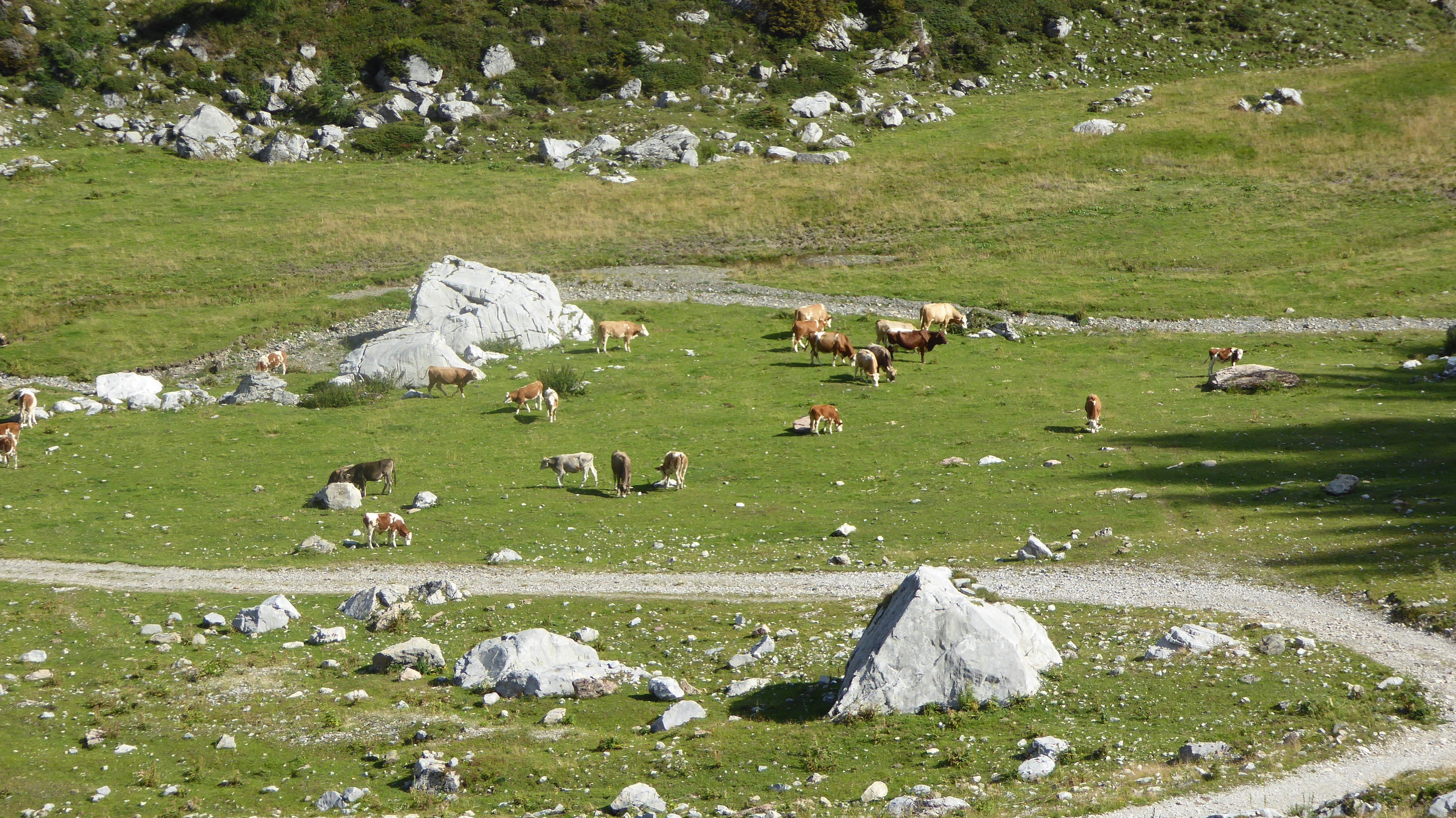 Tenendoci a Nord dei Monti di Volaia, scendiamo subito attraverso dei bei pascoli che cullano con la loro erba verde le molte mucche della malga Volaia.
