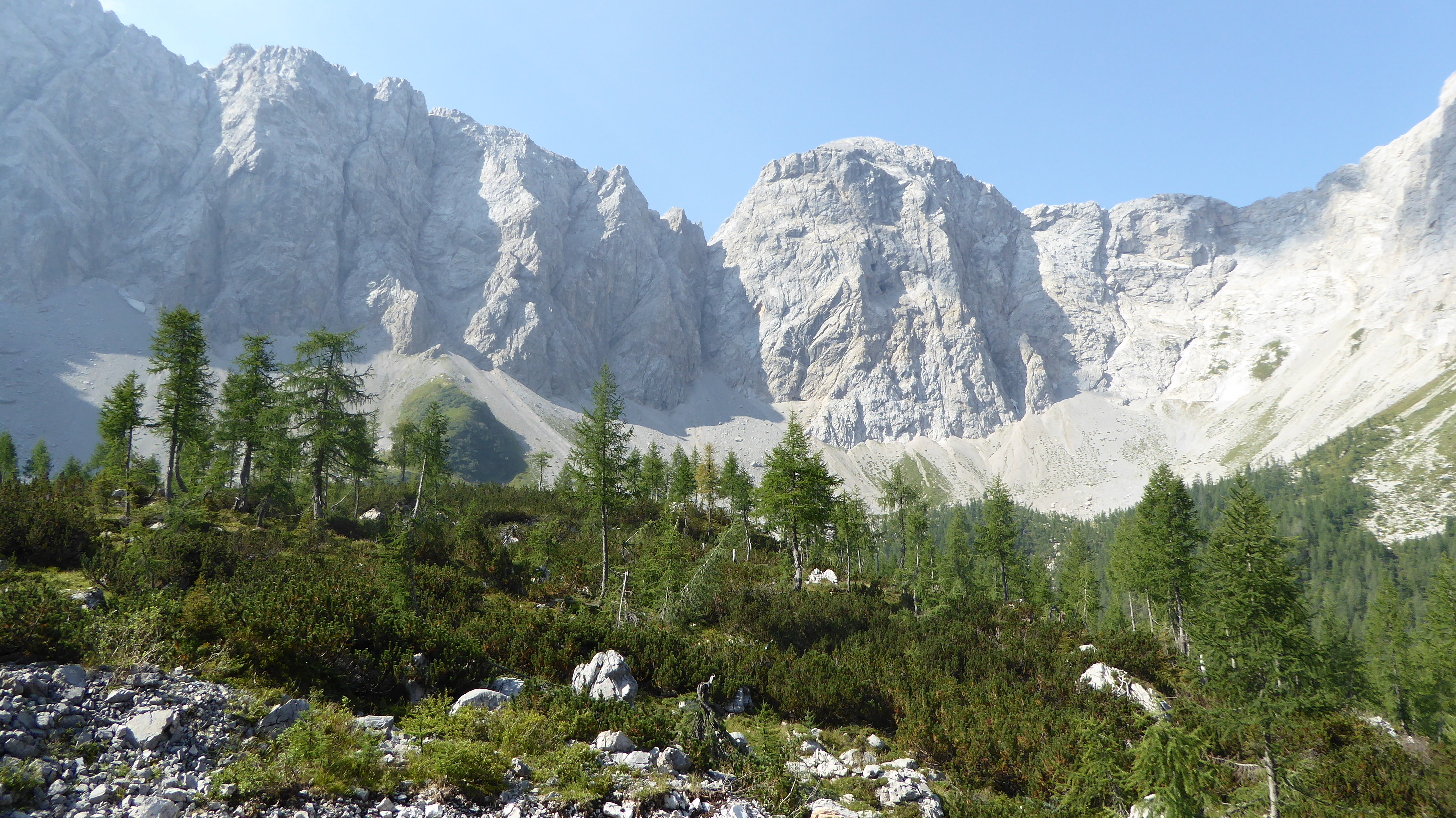 Dopo una mezz’ora abbondante di cammino siamo giunti a circa 1600 m, il bosco inizia a diradarsi e il sentiero inizia a farsi stretto e sempre in decisa salita ci fa avanzare tra grossi massi che fungono da scalette e pini mughi.