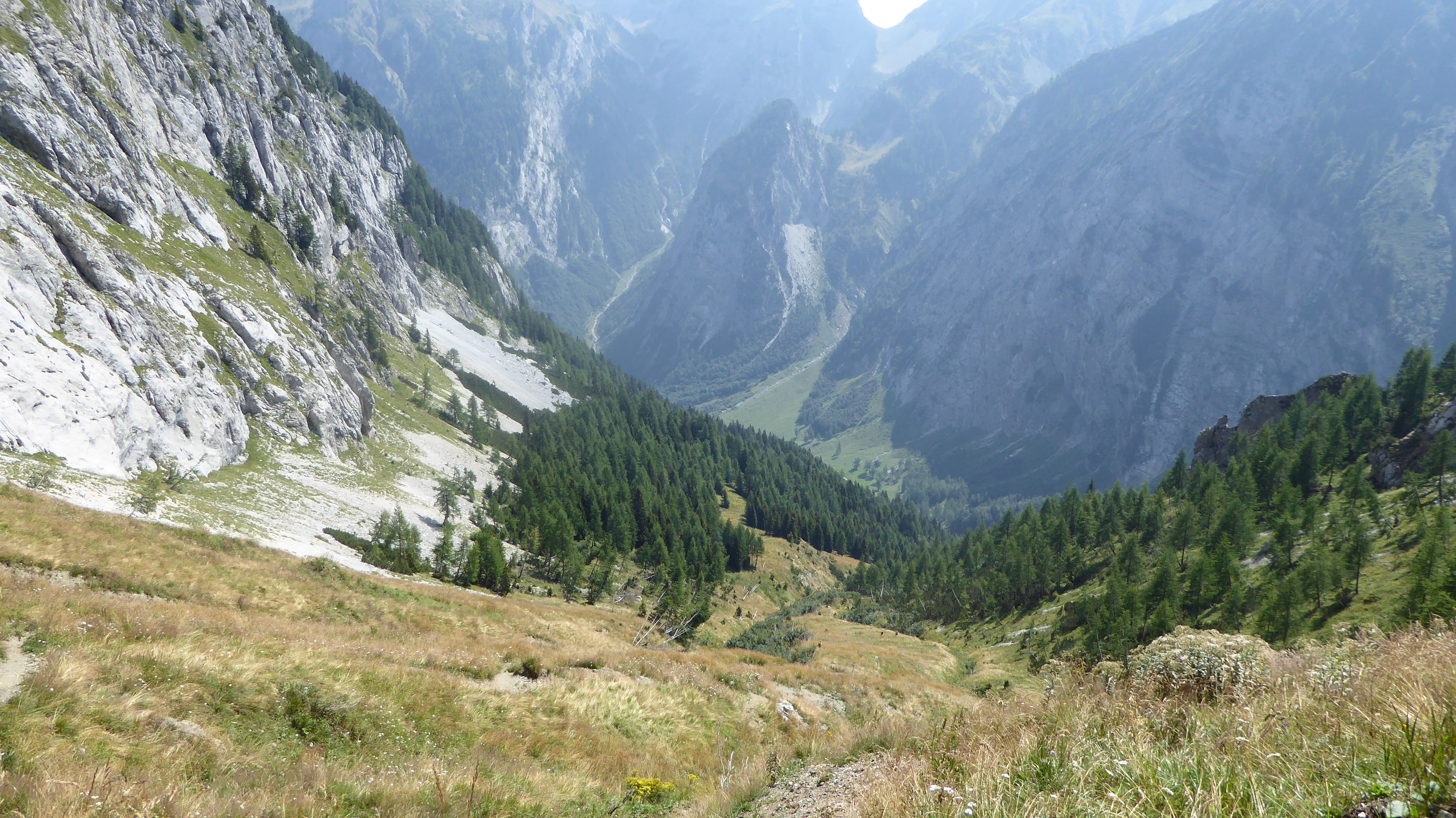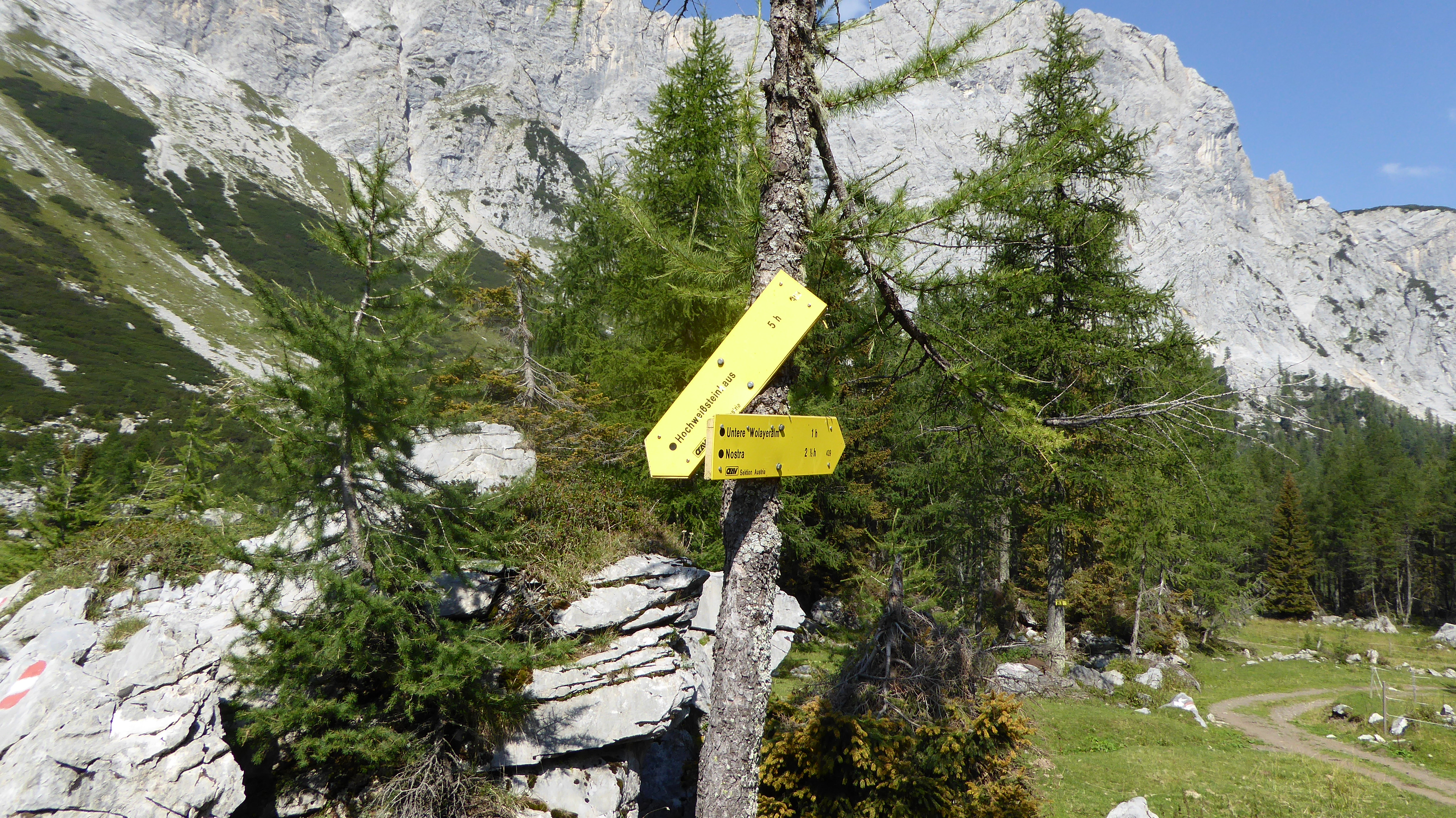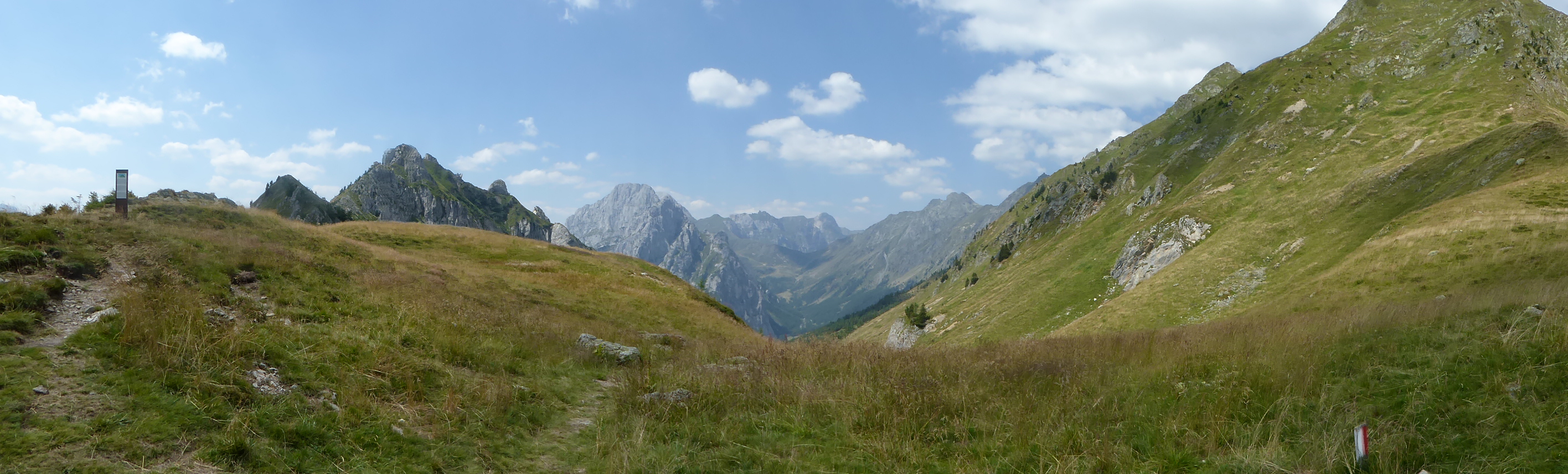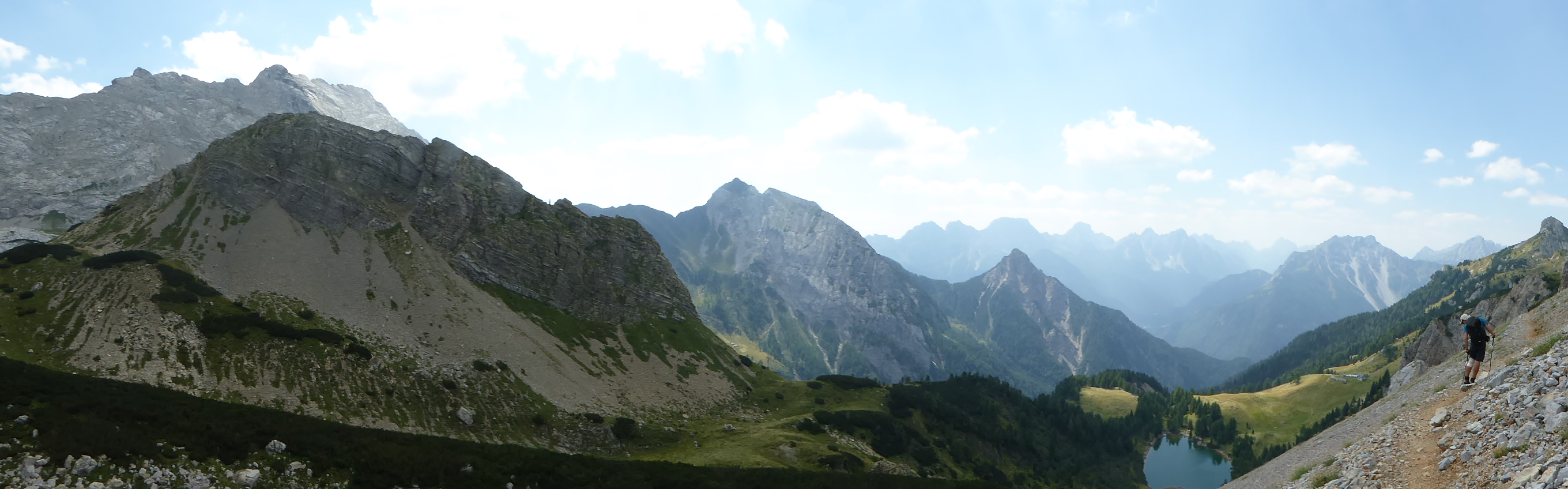 Dal passo Bimbaumer (2080 m) a pochi metri dal rifugio Wolayerseehutte, la nostra vista spazia dalla sottostante Alpe di Volaia fino a tutta la Carinzia e con questo spettacolo negli occhi iniziamo a scendere lungo il sentiero 403, ben indicato dai cartelli austriaci di colore giallo.