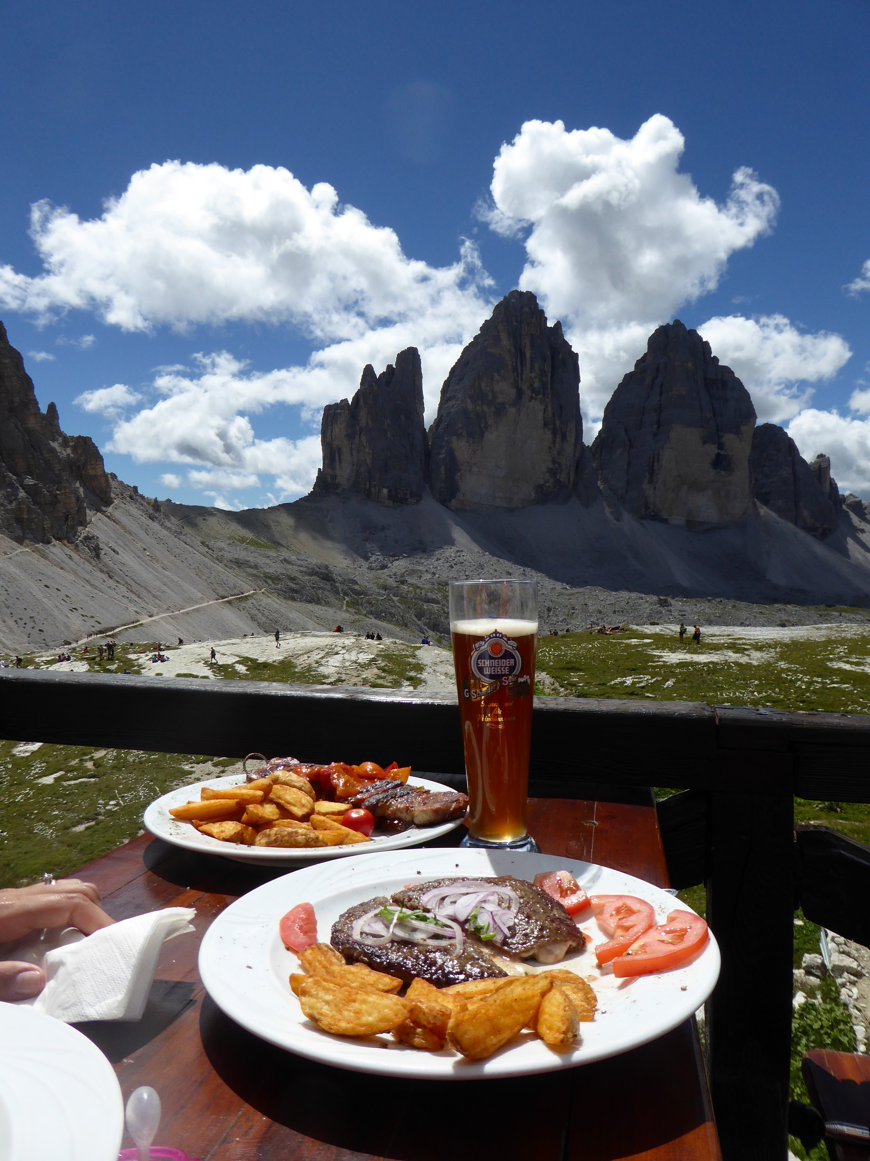 Sganciati i bambini dagli zaini non perdiamo tempo e ci affrettiamo a prendere posto sulla terrazza panoramica del Rifugio Locatelli per gustare le sue prelibatezze con un posto in prima fila sulle Tre Cime. se si è intenzionati a mangiare al rifugio, nei periodi estivi, soprattutto nelle due settimane a cavallo di ferragosto, si consiglia di cercare di arrivare alla meta non oltre le 11.30 per evitare l’enorme afflusso di gente che questo luogo magico attira. Ricordo che le vie per giungere al Rifugio Locatelli sono innumerevoli e collegano tra di loro più vallate quindi è bene organizzarsi con le tempistiche qualora si avessero bambini al seguito.