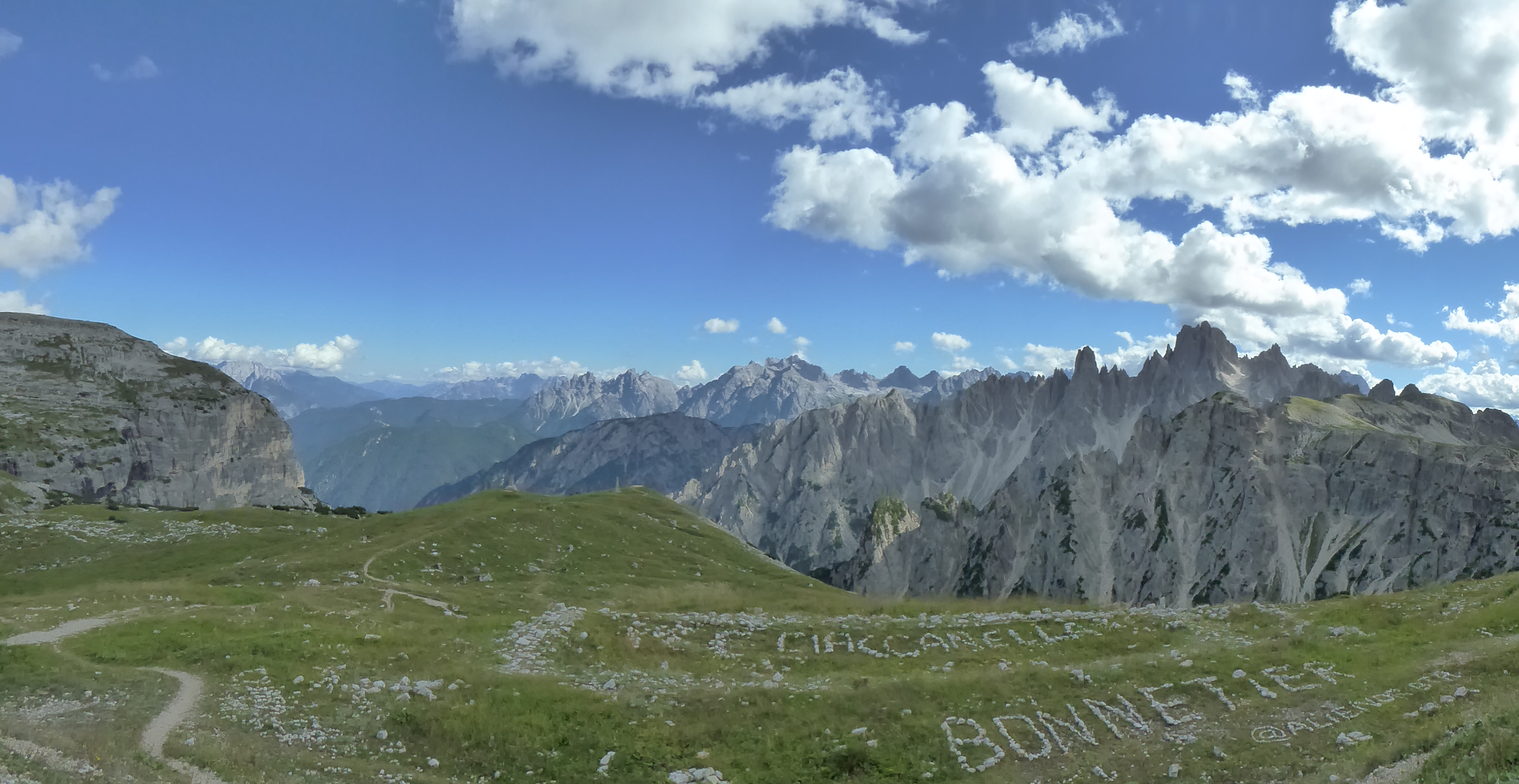 Dopo aver fatto le foto di rito con le Tre Cime e i Laghi dei piani alle spalle ci rimettiamo in marcia sulla via del ritorno imboccando sempre il sentiero 101 che ci permette di passeggiare tenendo sempre di fronte a noi lo spettacolo delle Tre Cime.