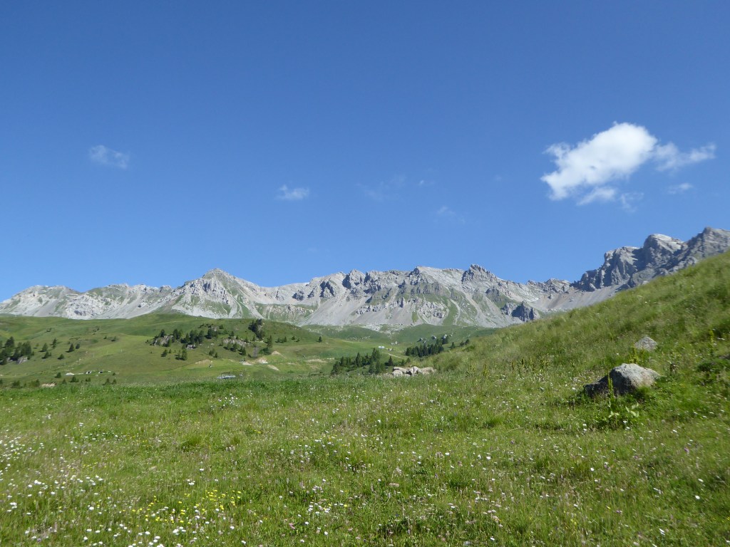 Dato il poco impegno fisico richiesto dal sentiero, siamo concentrati ad ammirare l’ambiente che ci circonda in ogni piccolo dettaglio ed ecco che ad un certo punto il bosco si apre come una porta sul Paradiso. Da qui in poi la meraviglia è davanti ai nostri occhi: quello che era bosco adesso è manto erboso circondato da cime e punteggiato in qua e in la da bei fiori bianchi e gialli, il tutto accompagnato dai tipici casoni e fienili della comunità che vive in questa zona, dando all’insieme quel tocco di rustico ma anche di fiabesco, quasi fossimo nel villaggio del nonno di Heidi.