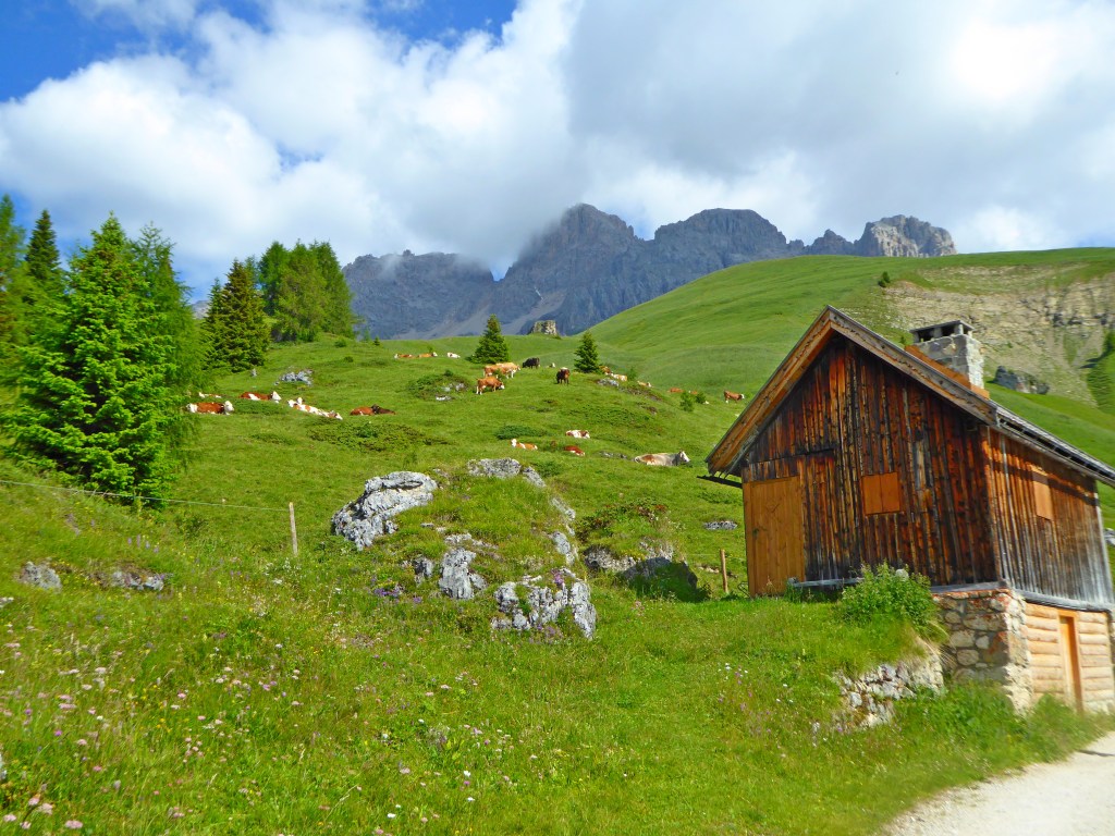 Girandoci verso destra, oltre l’infinita distesa verde, ogni passo è scandito da un quadretto tipico con sfondo le cime del Focobon (3054 m), il Col Margherita (2550 m) e unito attraverso le Pale di San Martino, il più lontano Monte Agner (2872 m).