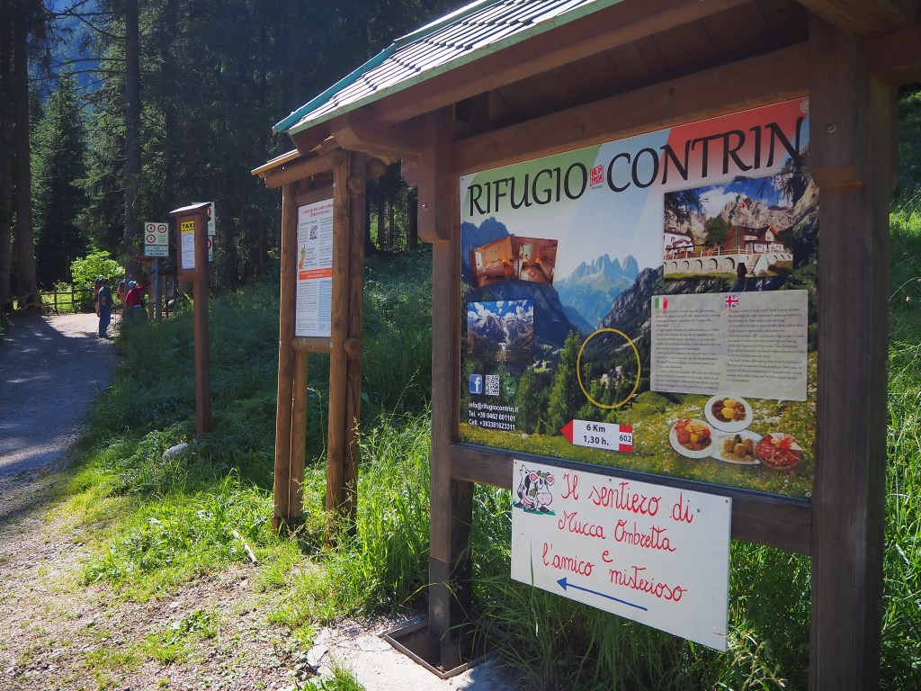Oltre ai segnavia del CAI, sono da subito presenti i cartelli del Rifugio Contrin e della simpatica storia della mucca Ombretta che ci accompagnerà per tutta la passeggiata.