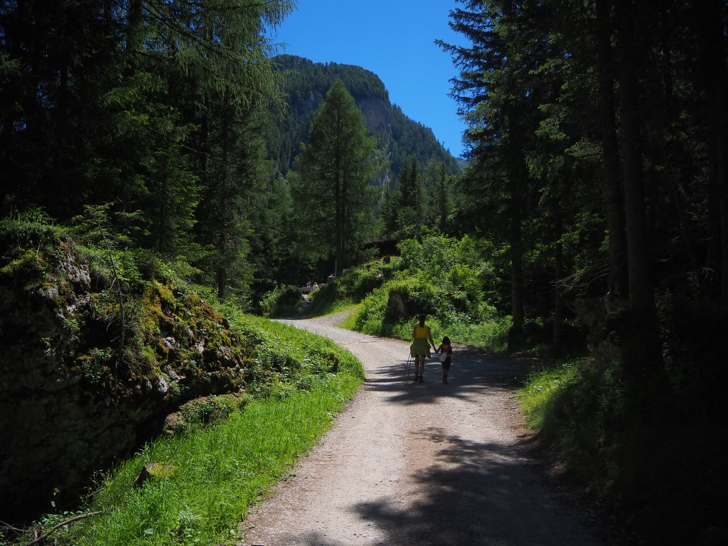 Da qui in avanti, su pendenza quasi nulla, ad ogni passo che facciamo, il paesaggio cambia e si mostra sempre di più nella sua bellezza. Tenendo sempre il corso del Rio Contrin alla nostra sinistra, iniziamo ad intravedere tra i rami degli alberi, una alla volta, La Cima Ombretta (3011 m), il Sasso Vernale (3058 m) e poi la muraglia dell’Ombretola (2931 m), del Palon de Jigole (2775 m), che da qui si estende fino al Passo San Nicolò racchiuso tra il Col Ombert (2670 m) e il Sas de Roces (2612 m), preceduti dalla Cima dell’Uomo (3010 m) col suo ghiacciaio.