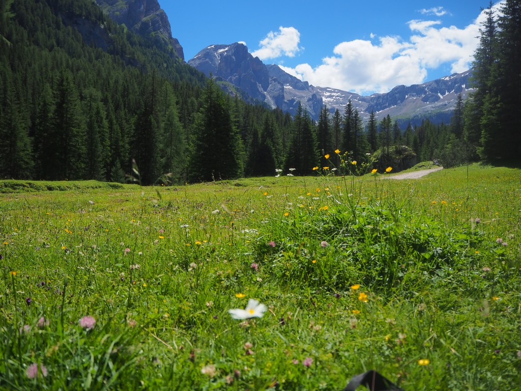 La passeggiata prosegue piacevole, attraverso i bei prati fioriti, rimanendo praticamente in quota, a 1770 m circa, per un’oretta, facendoci gustare tutte le meraviglie che questa valle ha da offrire, come uno smeraldo verde incastonato nella roccia dura.