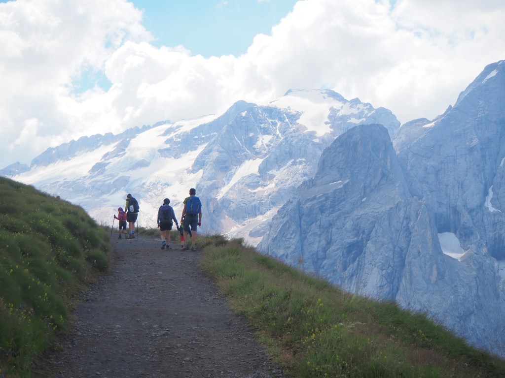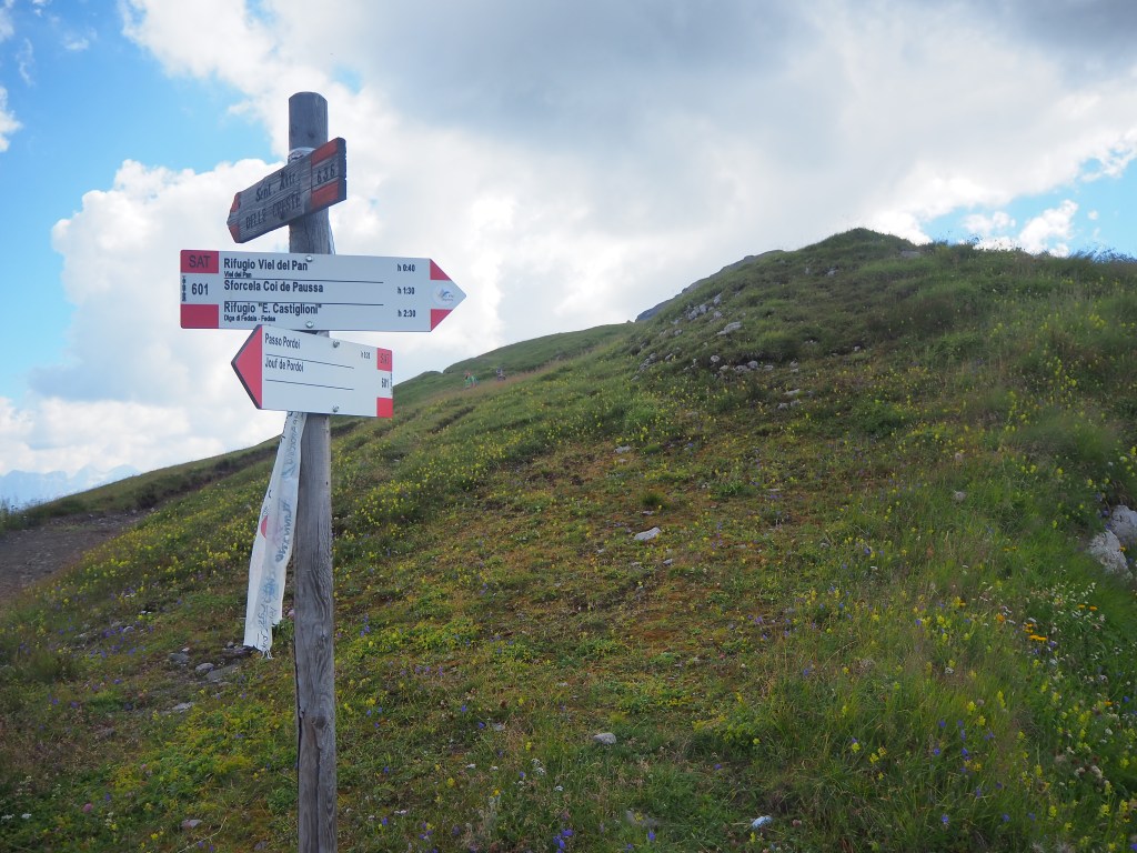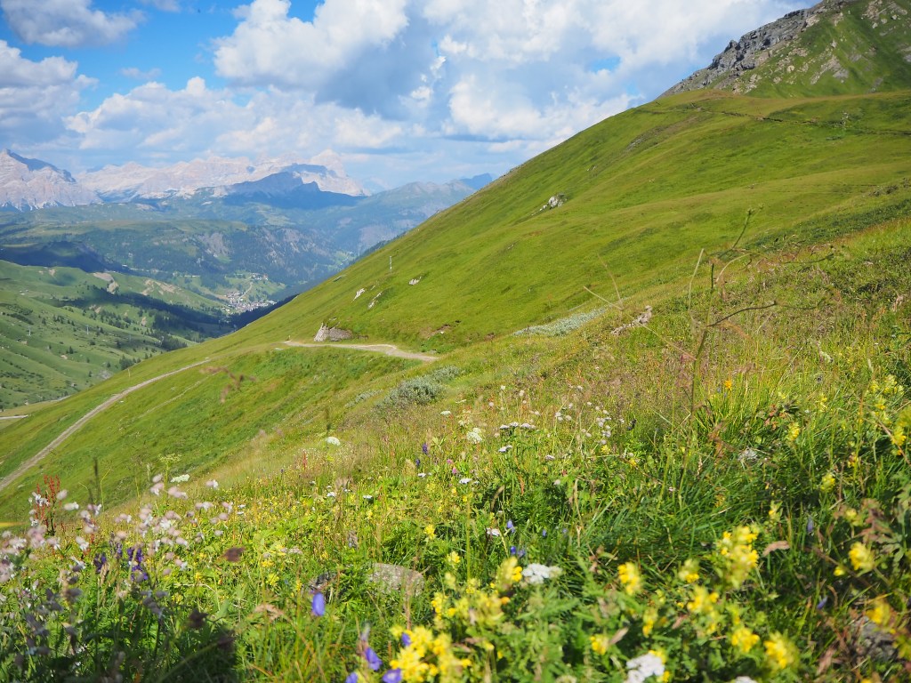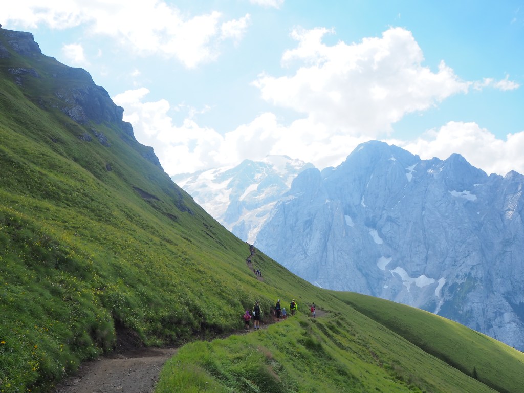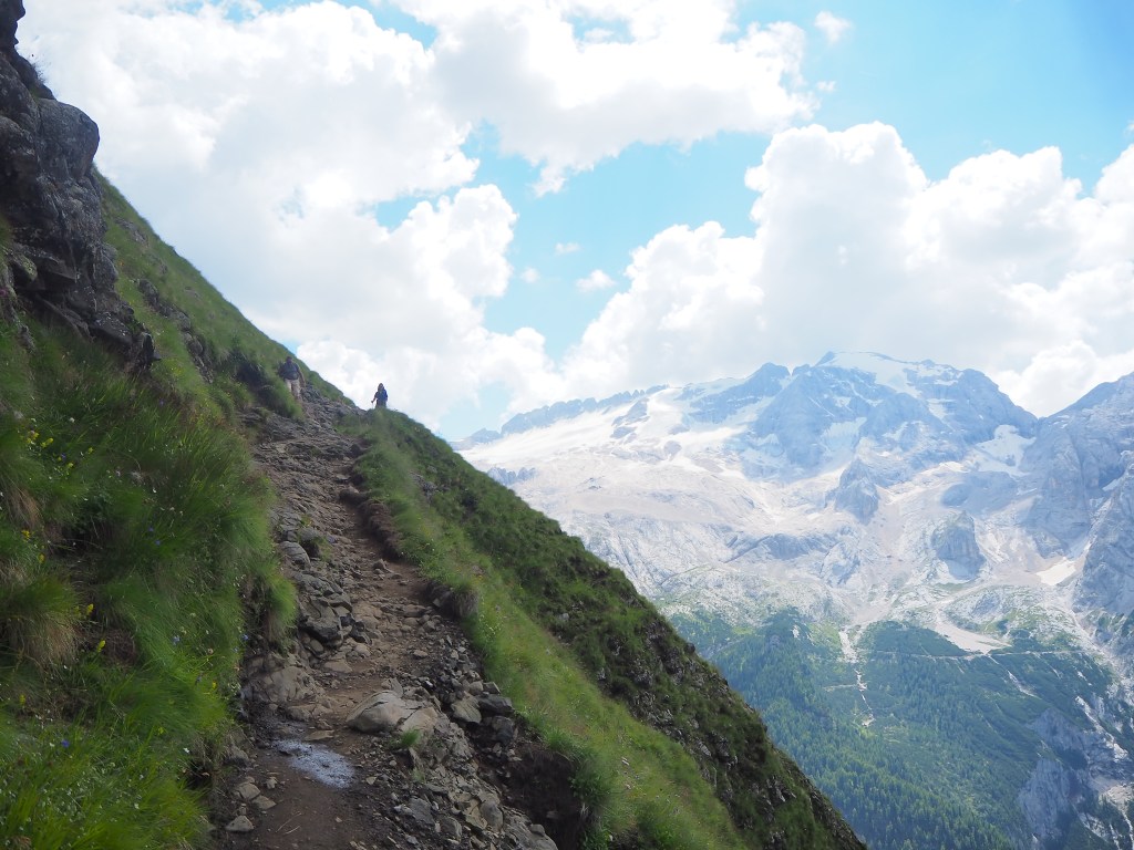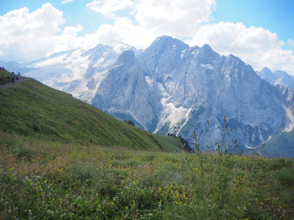 Procediamo dunque, sul Viel dal Pan, un sentiero sempre largo, su fondo battuto, che attraversa con dolci sali scendi le verdi dorsali che separano il Sella dalla Marmolada, ricordando in alcuni tratti, il paesaggio irlandese. La vista e il panorama ad ogni passo è incredibile: tra noi e la Marmolada c’è solo il vuoto lasciato dai pendii verdeggianti che portano, da Passo Fedaia, a Penìa. Aria pura, che ci da la sensazione di poter toccare la Marmolada con un dito. Alla nostra sinistra i fiori colorati punteggiano i prati verdissimi che si congiungono all’azzurro del cielo mediante l’aspra cresta del Sas de Ciapel.