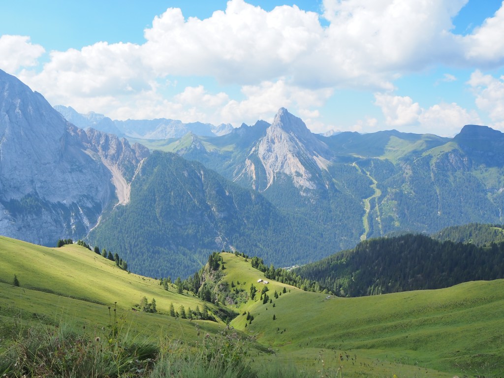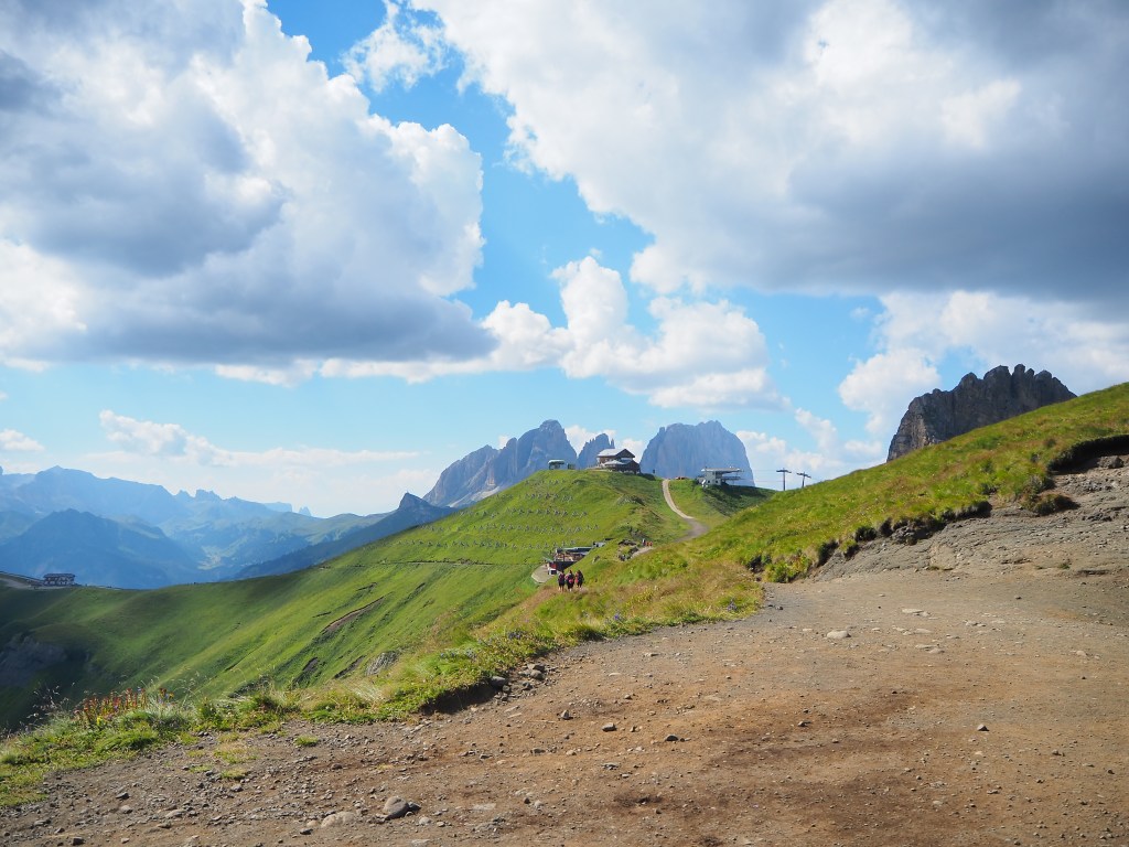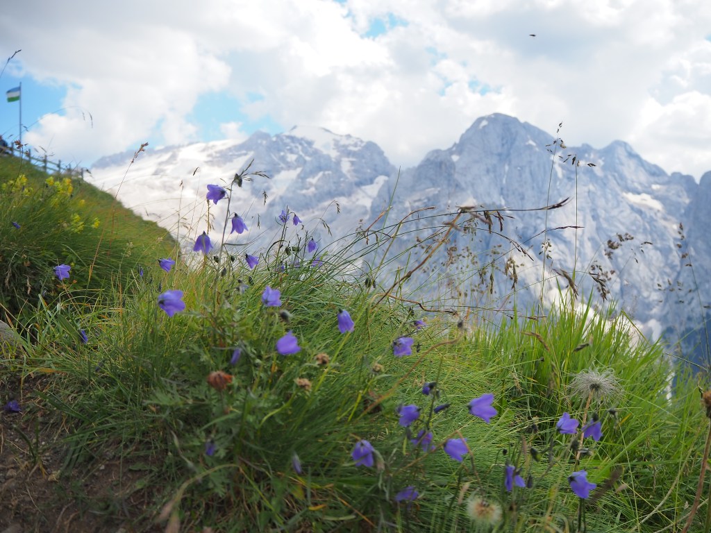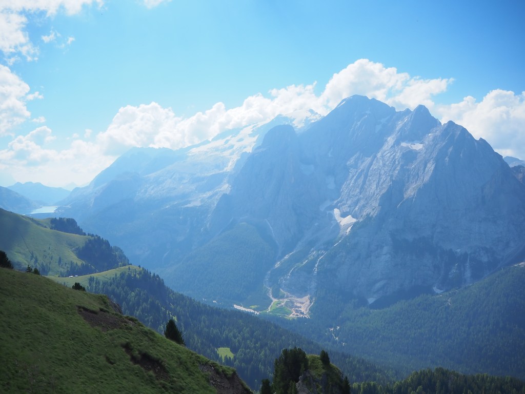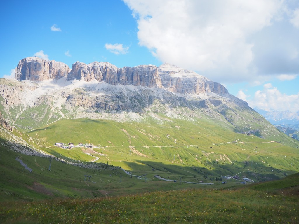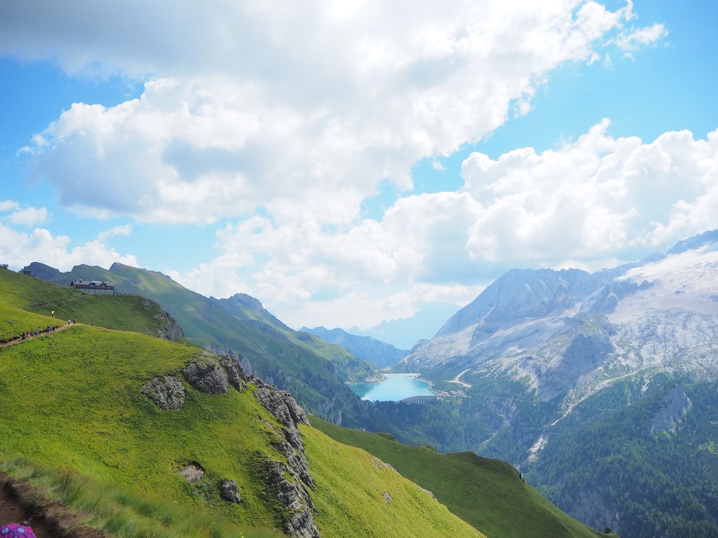 Procediamo dunque, sul Viel dal Pan, un sentiero sempre largo, su fondo battuto, che attraversa con dolci sali scendi le verdi dorsali che separano il Sella dalla Marmolada, ricordando in alcuni tratti, il paesaggio irlandese. La vista e il panorama ad ogni passo è incredibile: tra noi e la Marmolada c’è solo il vuoto lasciato dai pendii verdeggianti che portano, da Passo Fedaia, a Penìa. Aria pura, che ci da la sensazione di poter toccare la Marmolada con un dito. Alla nostra sinistra i fiori colorati punteggiano i prati verdissimi che si congiungono all’azzurro del cielo mediante l’aspra cresta del Sas de Ciapel.