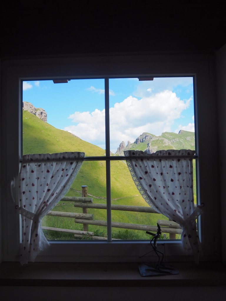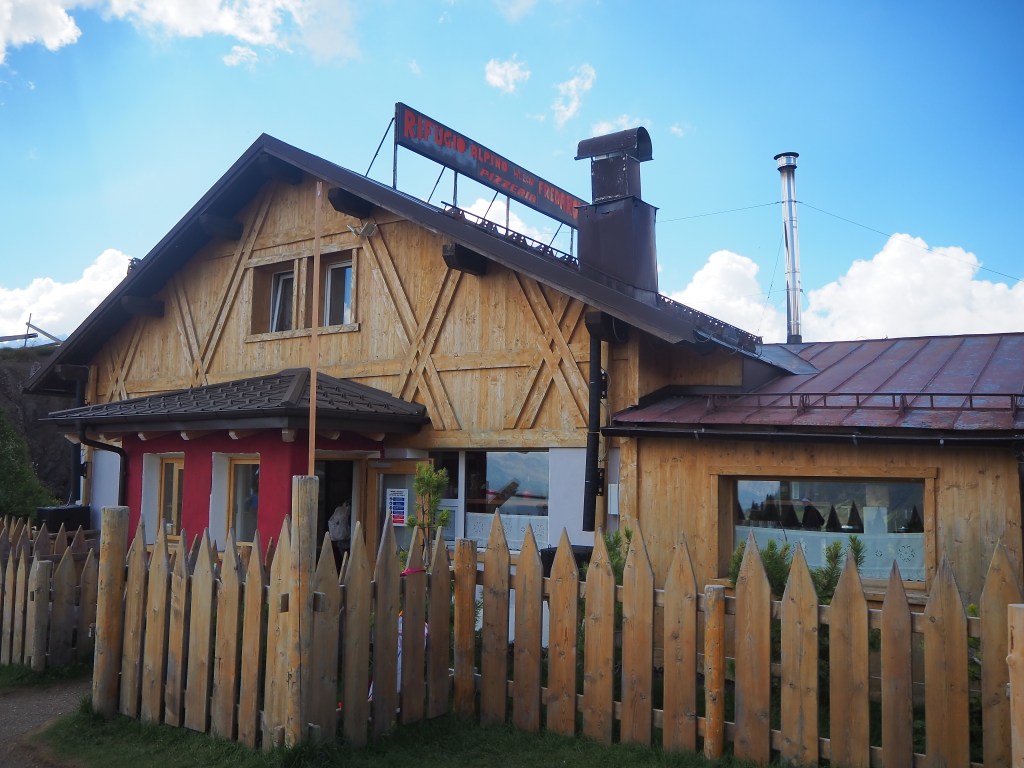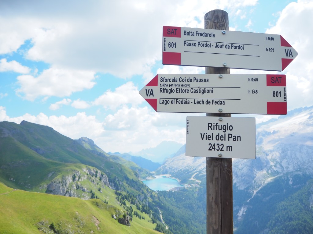 Nonostante questo, ci facciamo coraggio e iniziamo a scendere a 2335 m verso il Rifugio Belvedere, dove ci soffermiamo solo per raccogliere il timbro nel nostro passaporto. In poco tempo, mezz’oretta appena, raggiungiamo anche il già visibile, rifugio Baita Fredarola, modernissimo negli interni e dalla esclusiva terrazza relax con vista sulla Marmolada. Da qui inizia formalmente il Viel del Pan ma anche la via parallela, in cresta, su sentiero attrezzato, il tratto di Alta Via n.2 che lo raccorda col Passo Pordoi e una via dedicata alle MTB.