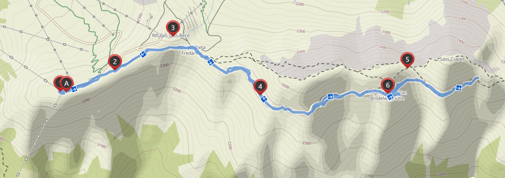 Tappe intermedie: Rifugio Belvedere (2335 m), Rifugio Baita Fredarola (2370 m)