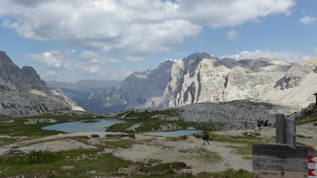Ci avviciniamo alla meta seguendo il sentiero 101 che costeggia comodamente, con leggeri sali scendi ma per lo più in discesa, il versante Nord del monte Paterno, accompagnati più a valle dai bei laghetti azzurri.