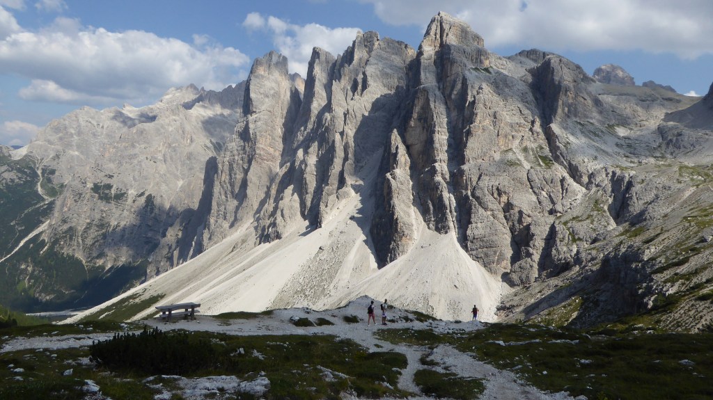 Saliamo a quota 2519, dove giunti al Passo Fiscalino, la vista si apre su un altro mondo rispetto a quello da cui eravamo partiti. Da qui infatti possiamo ammirare da sinistra verso destra, rispettivamente, il Monte Cengia (2559 m), al Centro i Cadini di Misurina e più in fondo il Cristallo, dunque proseguendo il giro possiamo ammirare la Croda Rossa d’Ampezzo (3146 m) e, subito dietro alla Croda Passaporto (2681 m), una dietro all’altra, in fila indiana, le Tre Cime di Lavaredo e quindi la cima del Monte Paterno (2747 m).