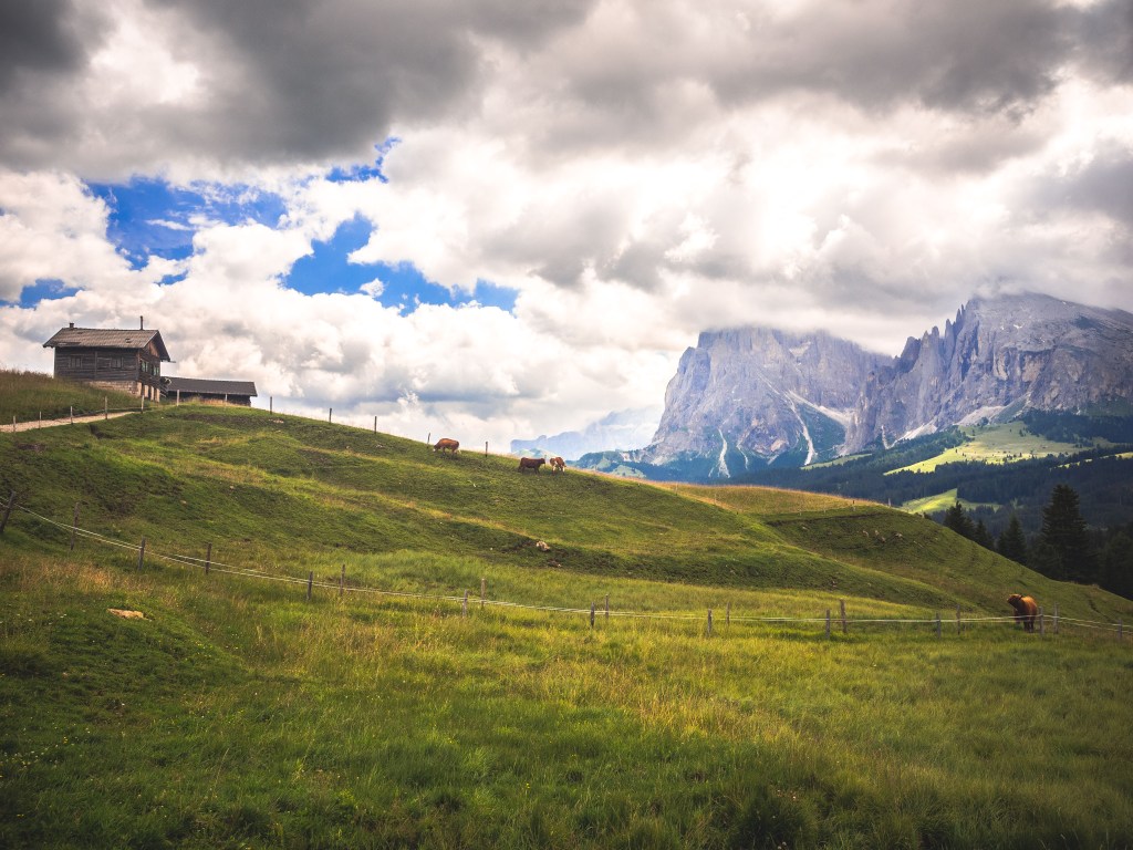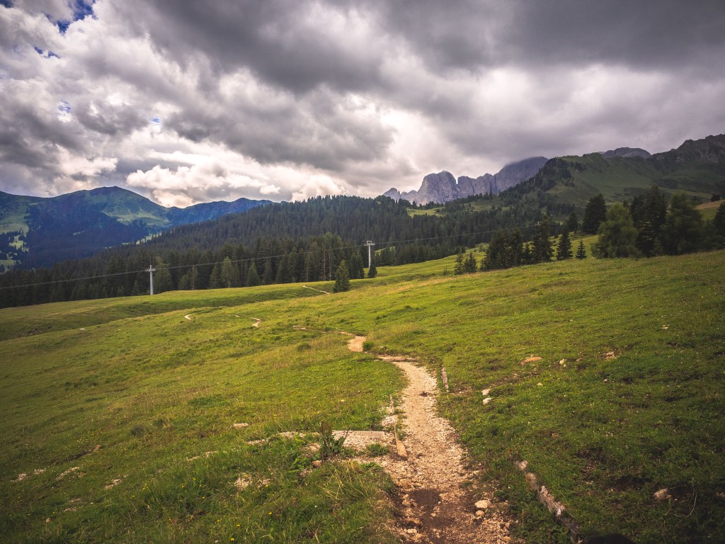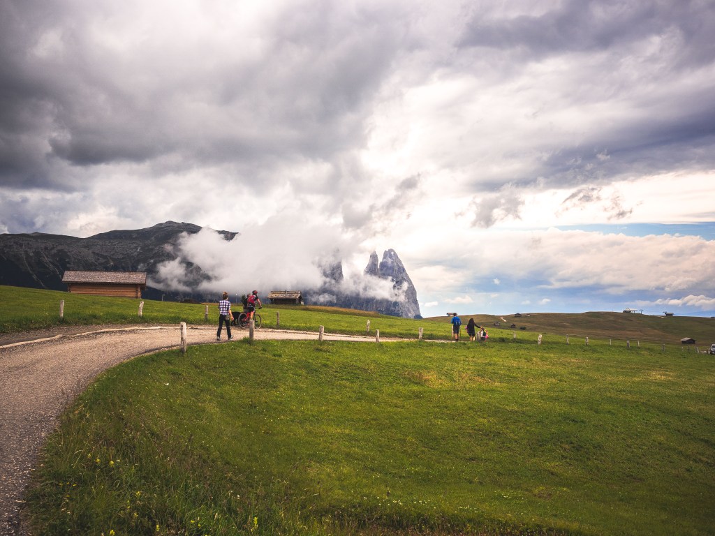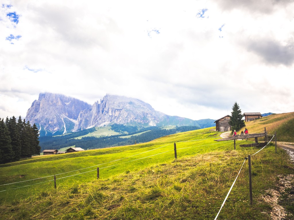 Terminata la mini pausa, ritorniamo sul sentiero che da qui in poi è una strada asfaltata, quindi occhio al passaggio di mezzi motorizzati. Si passeggia tranquillamente in discesa ammirando a destra lo Sciliar, che oggi a volte è coperto dalle nuvole a volte riappare, e a sinistra il Sassolungo e il Sassopiatto.