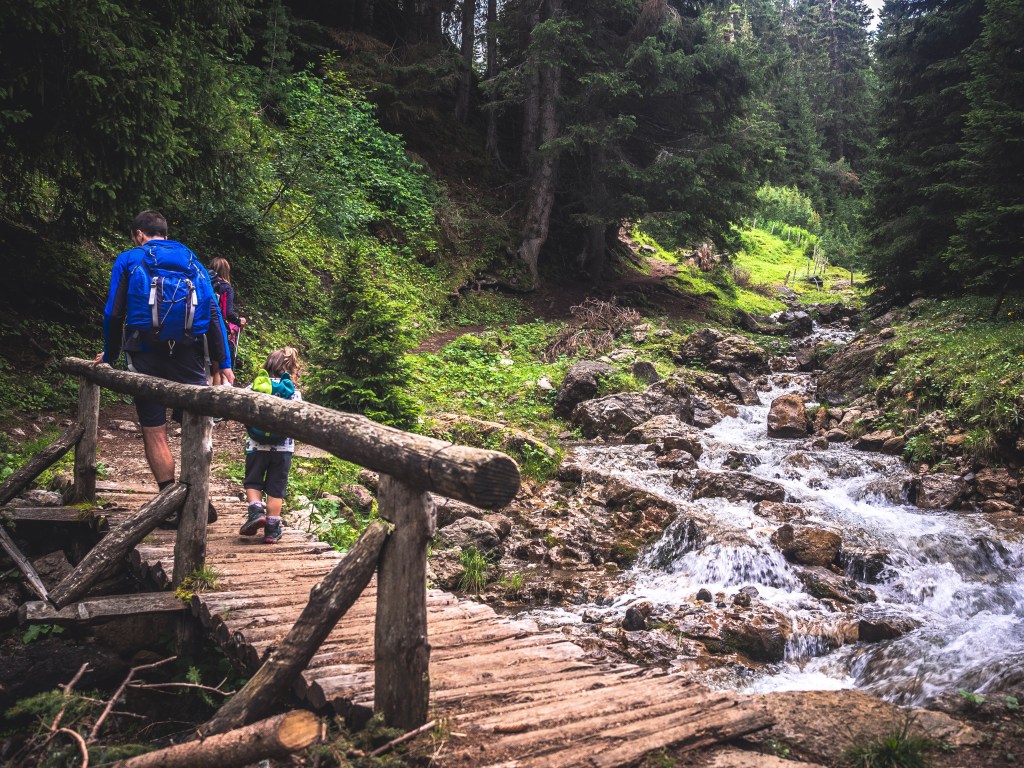 Qui il sentiero diventa un po’ più impegnativo per i più piccoli. Infatti, tenendo sotto di noi, alla nostra sinistra, un bel torrente, il sentiero si fa più stretto, a tratti molto sassoso e misto al fango della notte precedente, anche scivoloso. Affrontiamo con abbastanza disinvoltura il primo attraversamento su pietre di un grosso rigagnolo che si immette nel torrente sotto di noi e poi, giungiamo ad un bel ponte di legno che ci permette di portarci sull’altra sponda del torrente. Il sentiero, quindi, sempre stretto e in mezzo alle conifere, sale deciso fino a farci sbucare, dopo circa 20 minuti da Laranzer, a Casa Mutz.