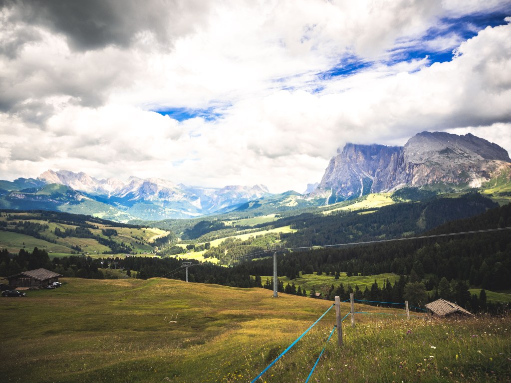In poco meno di 20 minuti eccoci alla sommità della salita e da qui possiamo nuovamente ammirare la vastità dell’Alpe di Siusi, ma soprattutto, poco più in giù vediamo le bandiere di Edelweiss Hutte, nostra prossima meta per il dolce post pranzo.