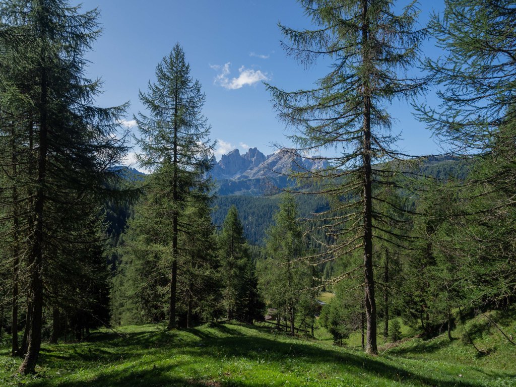 Il sentiero scorre sul versante Sud Ovest del Pizzo Forca (2285 m) in direzione Nord Ovest. Da qui basta volgere leggermente la testa vesro sinistra ed ecco che la Nord dell’Agner (2872 m), la Cima di Focobon (3054 m) e il Monte Mulaz (2906 m) si mostrano in tutta la loro magnificienza.