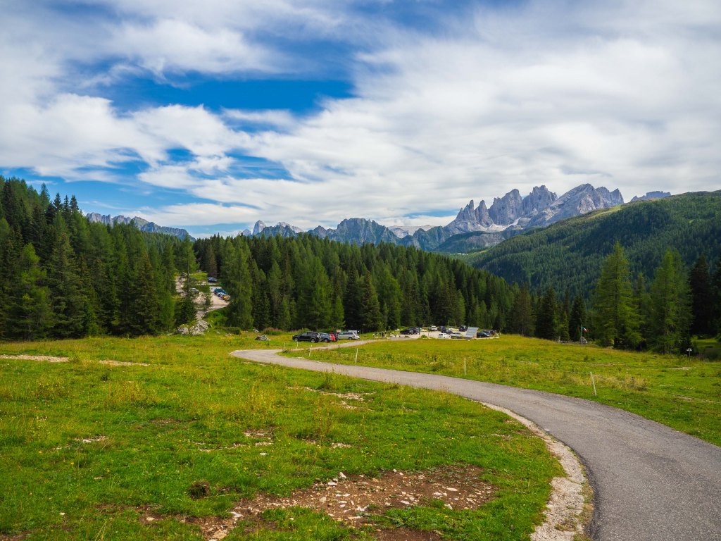 Terminata la nostra pausa, dopo esserci riposati un po’, ci rimettiamo in marcia ssulla via del ritorno, dato che le nuvole, sempre spinte dal vento freddo di questa giornata, vanno e vengono. Proseguiamo dunque sul sentiero 607 in direzione Passo San Pellegrino un po’ in discesa e un po’ in salita attraverso i bei tabià che tempestano i prati che ci circondano. Giunti al primo bivio, svoltiamo alla nostra sinistra, in località Col Codè (1950 m) e seguiamo la strada sterrata che ci accompagna dapprima in mezzo and altri bellissimi casoni e poi ci porta a costeggiare il bosco sempre in rapida discesa.