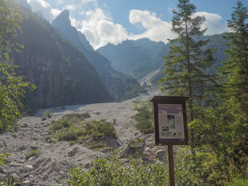 Un primo tratto di sentiero asfaltato affianca il letto larghissimo e di sassi bianchissimi del Torrente Prampera. Lasciamo alla nostra sinistra il Giaron de la Fopa, uno dei più imponenti ghiaioni delle Dolomiti che riversa sul Torrente Pramper una quantità enorme di detriti, frutto della disgregazione delle pareti verticali, facendo un salto di mille metri di dislivello.