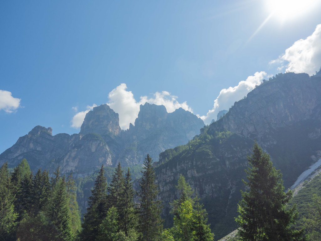 Parcheggiata l’auto quindi, ci mettiamo in marcia lungo il sentiero 523 con passo tranquillo, sotto lo Spiz di Mezzodì (2324 m), alla nostra sinistra, costeggiando il bosco che, alla nostra destra, si fa via via sempre più fitto.