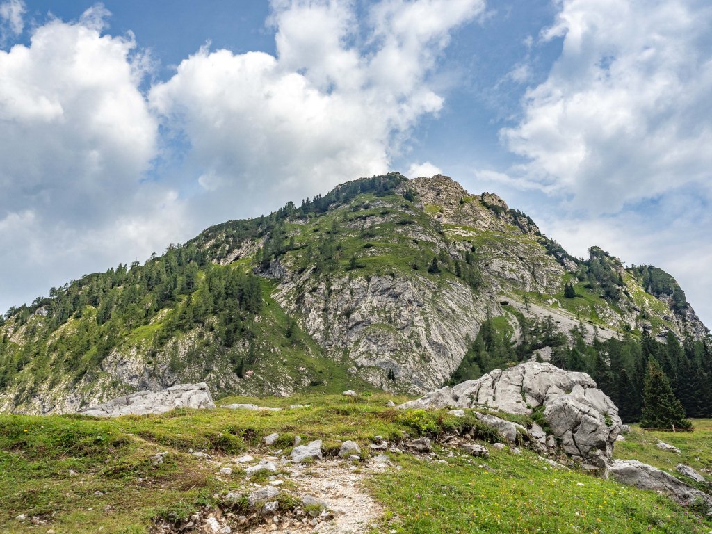 Sempre in salita, sempre più accentuata, camminiamo per pochi minuti sotto le conifere ai piedi del Monte Geu (2109 m) e dopo un ora abbondante totale di cammino, ci ritroviamo su un piccolo tratto sassoso, contornato da pini mughi, al di la dei quali, la vista su Sappada allieta la nostra camminata.