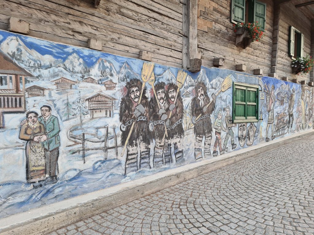 Qui, tra una chiesetta e l’altra, costruite lungo la strada, nelle varie borgate, troviamo un bel murales che racconta una storia dei Rollate, le tipiche maschere del carnevale sappadino.