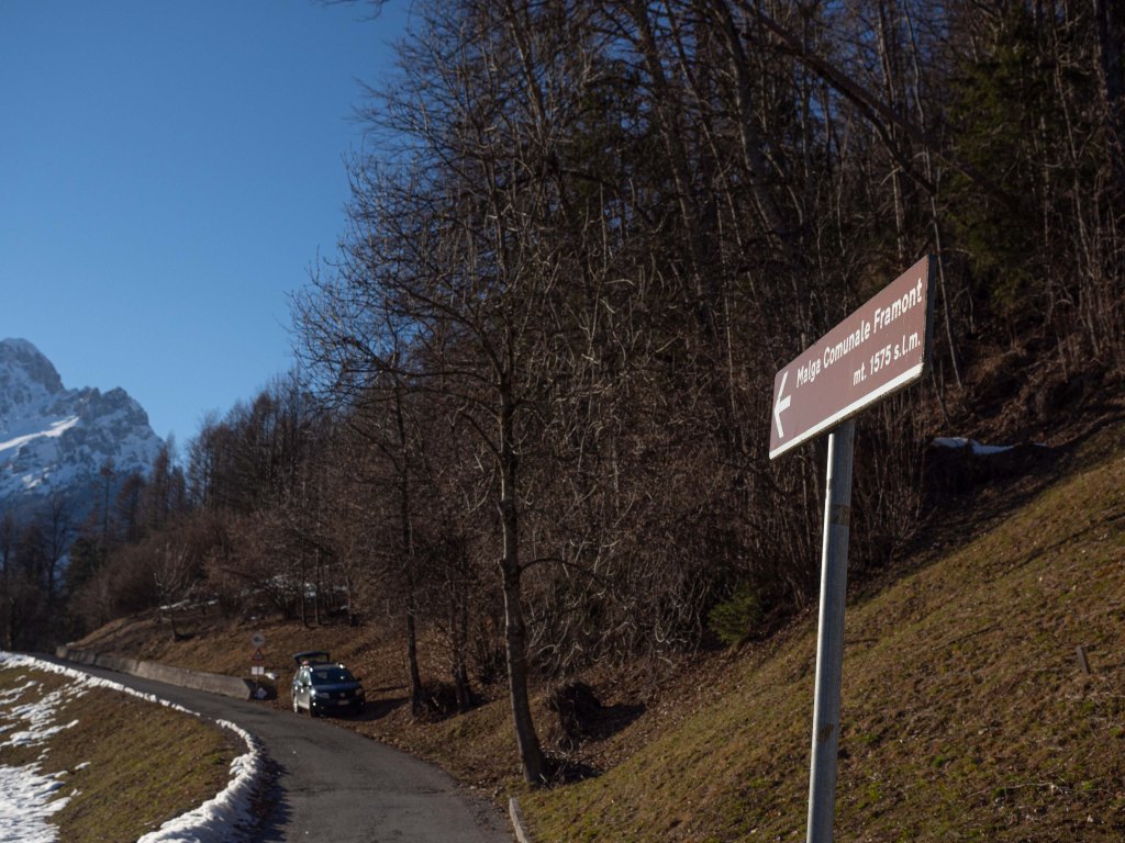 Non la attraversiamo ma procediamo, seguendo la strada principale, alla nostra sinistra, seguendo le indicazioni per Malga Framont.