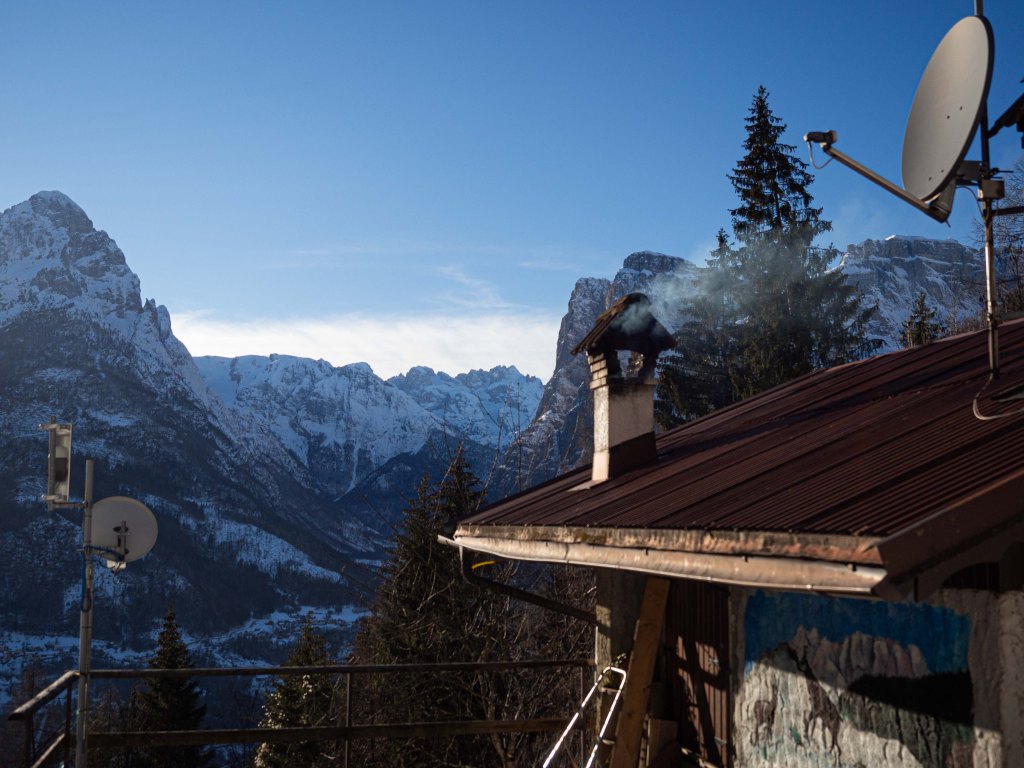 Seguendo la strada principale, quindi, sempre in discesa, manteniamo il caseggiato di Farenzena alla nostra sinistra e tra un tornante e l’altro ammiriamo dall’alto la conca agordina, imbiancata e incastonata tra le vette Bellunesi, i Monti del Sole, il gruppo della Cimonega, il gruppo dell’Agner e le Pale di San Lucano.