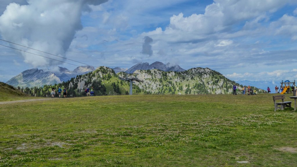 Iniziamo la nostra giornata partendo dall’ovovia della Ski Area Alpe Lusia, aperta anche in estate che comodamente e in pochi minuti, ci porta allo Chalet Valbona a 1831 m. Usciti dalla stazione intermedia dell’intera linea dell’ovovia, già lo spettacolo verso Nord sulla Roda di Vael e sulle Torri del Vajolet è da lasciare a bocca aperta. Ma ben altre cose lasciano a bocca aperta i più piccoli, cioè il grande parco giochi dello Chalet e qui li lasciamo liberi di giocareper un bel po’. Qui ce n’è veramente per tutti i gusti: scivoli, altalene, sabbiere e anche una tenda sioux nella quale si può entrare!