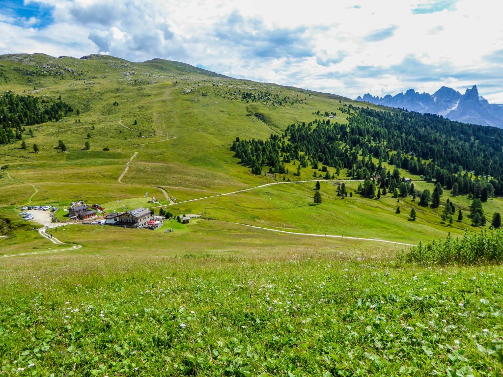 In mezz’ora di cammino raggiungiamo il Rifugio Passo Lusia a 2055 m, avvolto da bellissimi prati appena tagliati e qui, ammirando i versanti de Le Mandre (2275 m) e del Lastè di Lusia (2410 m), ci sdraiamo per una sosta ed un panino al sacco dato che tra i giochi e le foto ai panorami si è fatto quasi mezzogiorno.
