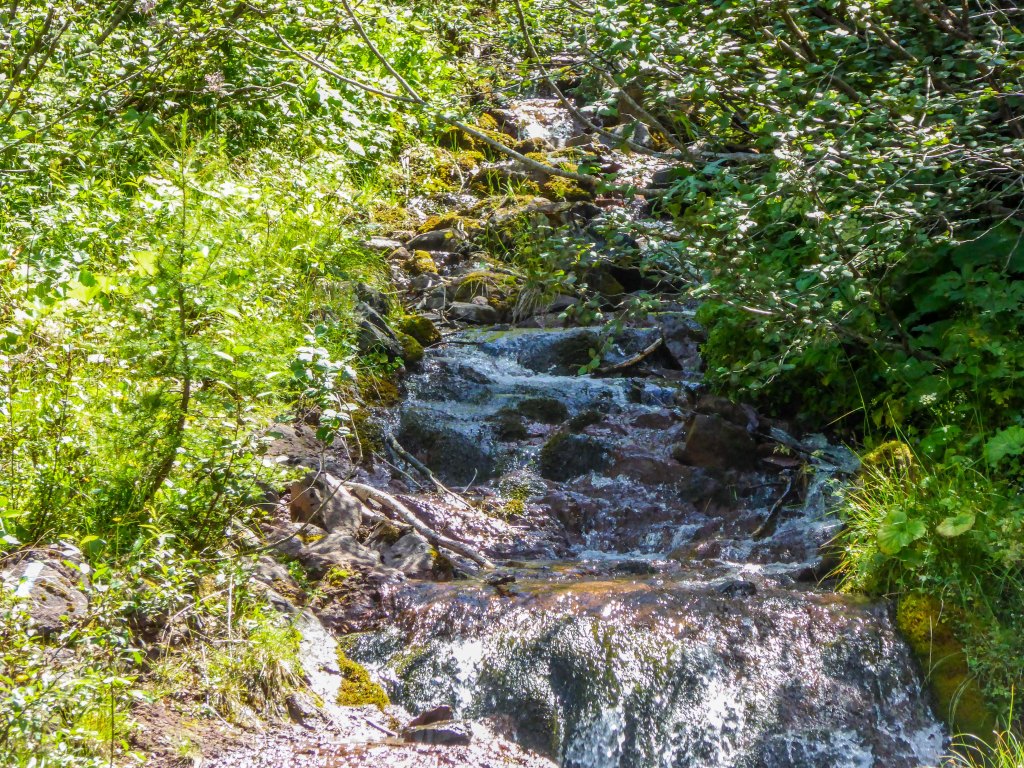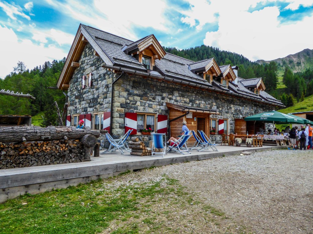Dopo di questo tratto, il sentiero inizia a prendere, deciso, una pendenza verso il basso, su fondo erboso e carreggiate di cemento per agevolare le salite e le discese dei mezzi che servono i vari rifugi. Qui c’è un po’ da stare attenti a non scivolare e a non farsi male alle ginocchia ma niente di trascendentale. Se siete con bambini per mano, accompagnateli e rassicurateli, anzi, spiegate loro con tranquillità come affrontare queste discese procedendo a zig zag.