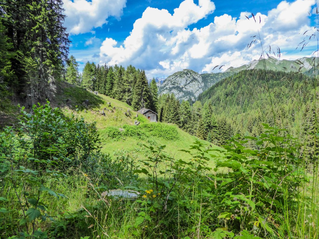 Imbocchiamo dunque il sentiero 625 che taglia di traverso il bosco, sempre senza alcuno strappo di salita. Questo sentiero è stretto, attraverso i rami delle conifere e su fondo misto a terra battuta e radici. Con questo piccolo tratto di avventura, anche se comunque in falso piano, ritorniamo in zona Valbona e saliamo alla Malga de Poza a 1868 m, per ammirare i cavalli e le caprette che vivono nei recinti attorno a questo bell’edificio.