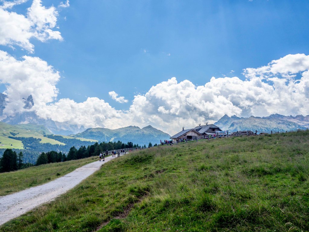 Il primo tratto, molto carino, è un piccolo sentiero che scorre tra bellissimi pini di diverse dimensioni e sale leggermente fino ad incontrare la via principale che giunge dal Passo Lusia, alla nostra sinistra. Giunti a questa intersezione, svoltiamo a destra dove il sentiero, aperto e arieggiato, ci fa attraversare dei bei prati punteggiati in qua e in la da dei bei gruppetti di tabià tirati a nuovo che ci lasciano sbalorditi dalla loro bellezza.