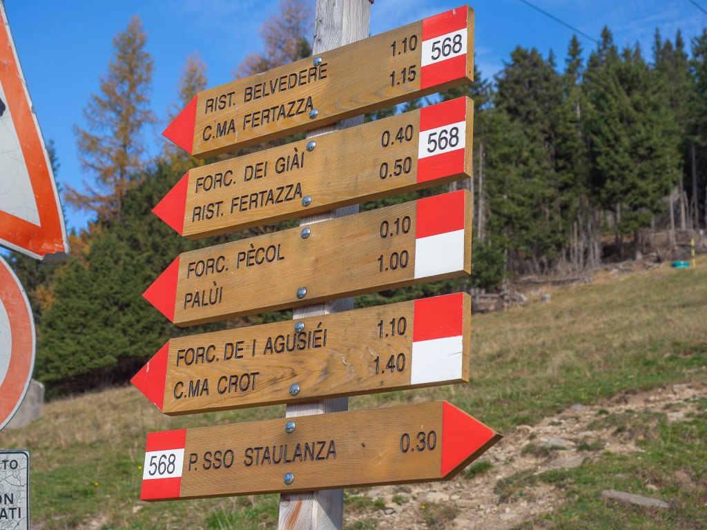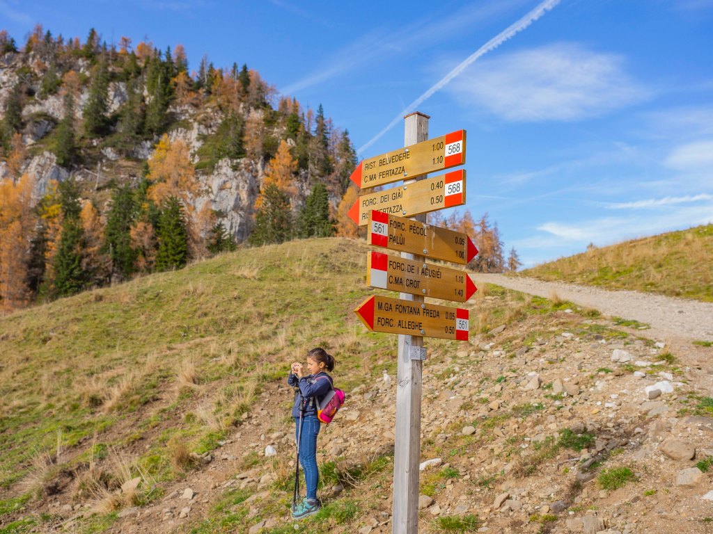 Ci mettiamo in marcia proseguendo lungo il sentiero 568, in direzione Cima Fertazza, Ristoro Belvedere. Il sentiero, sempre largo e senza nessuna difficoltà tecnica, fa sì che la passeggiata sia rilassante e piacevole. Infatti dopo un primo tratto aperto, dove continuiamo ad ammirare a bocca aperta la mescolanza di colori del bosco, con un tornante raggiungiamo il bivio con il sentiero 561, che lasciamo alla nostra destra, e proseguiamo addentrandoci nel bosco.