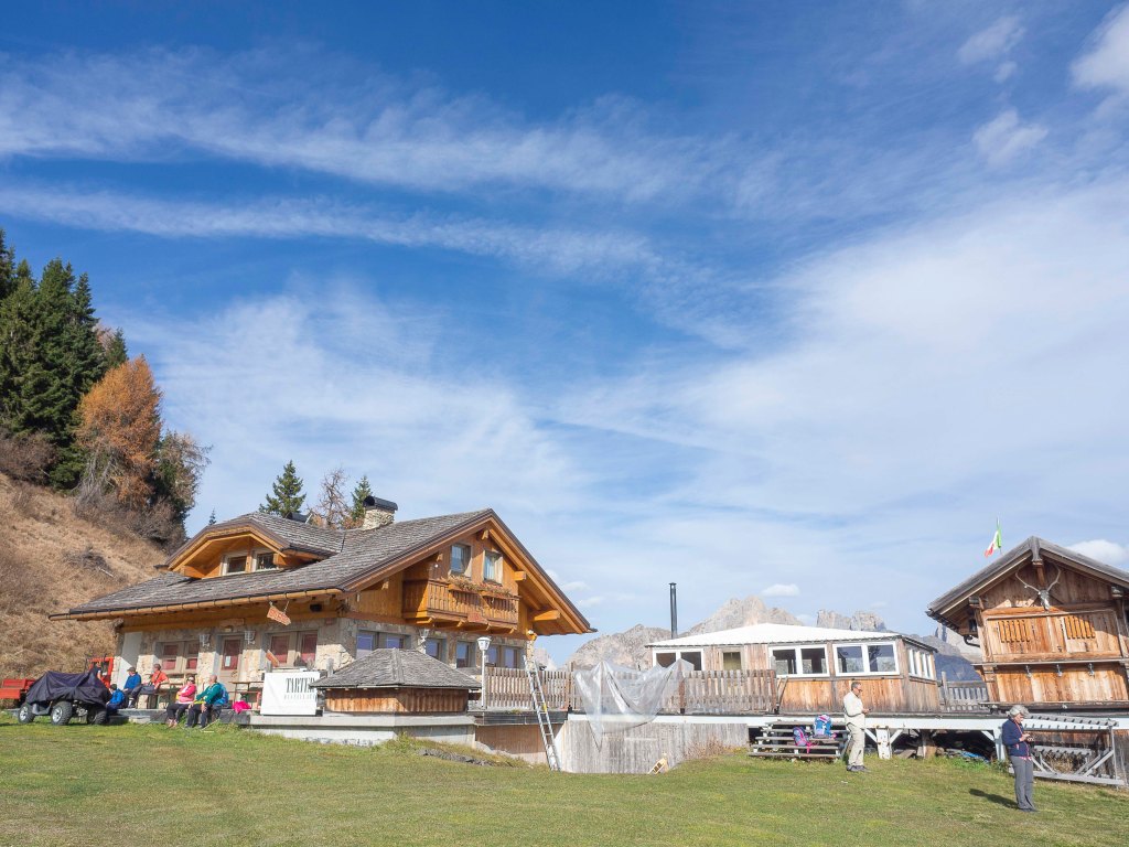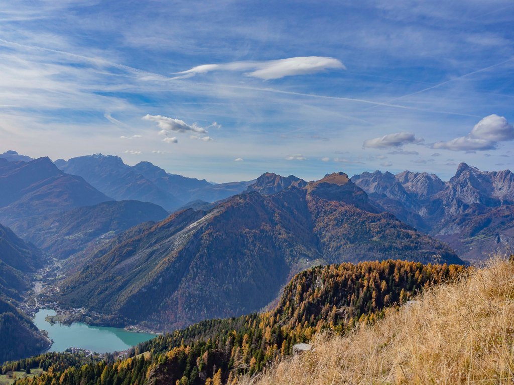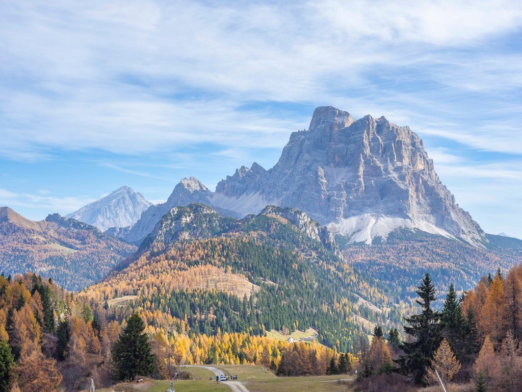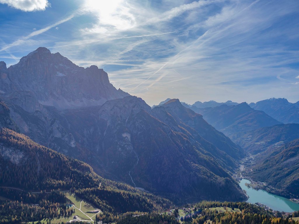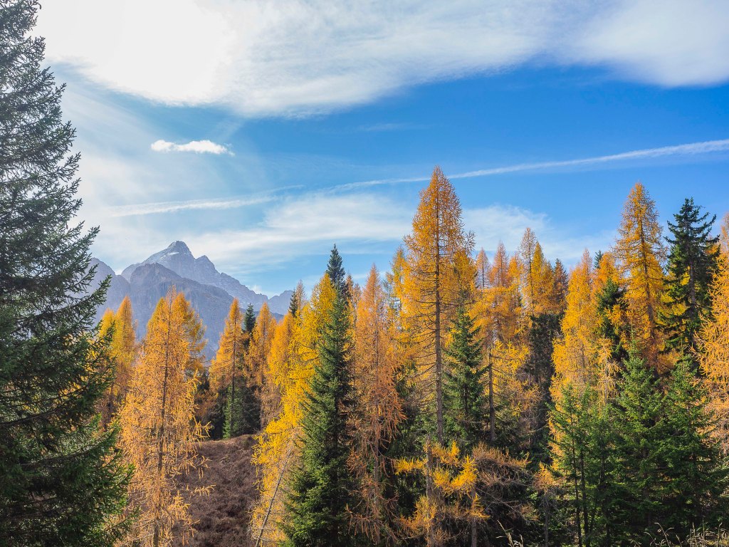 Una volta scesi, il luogo si presenta già magico: l’aria frizzantina di fine ottobre condisce la splendida vista sul Col dei Baldi (1922 m), tinto di giallo e verde; più in la, Cima Coldai (2403 m) e il Monte Civetta (3220 m) che svetta altissimo fanno da cornice a questo che sembra un quadro impressionista.