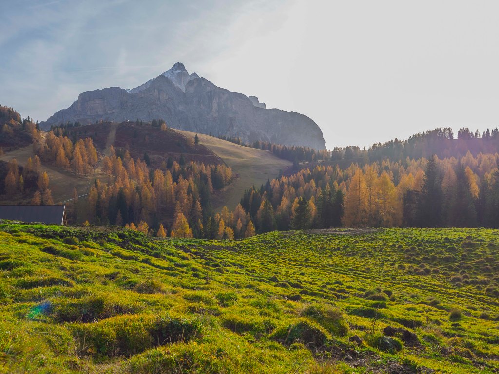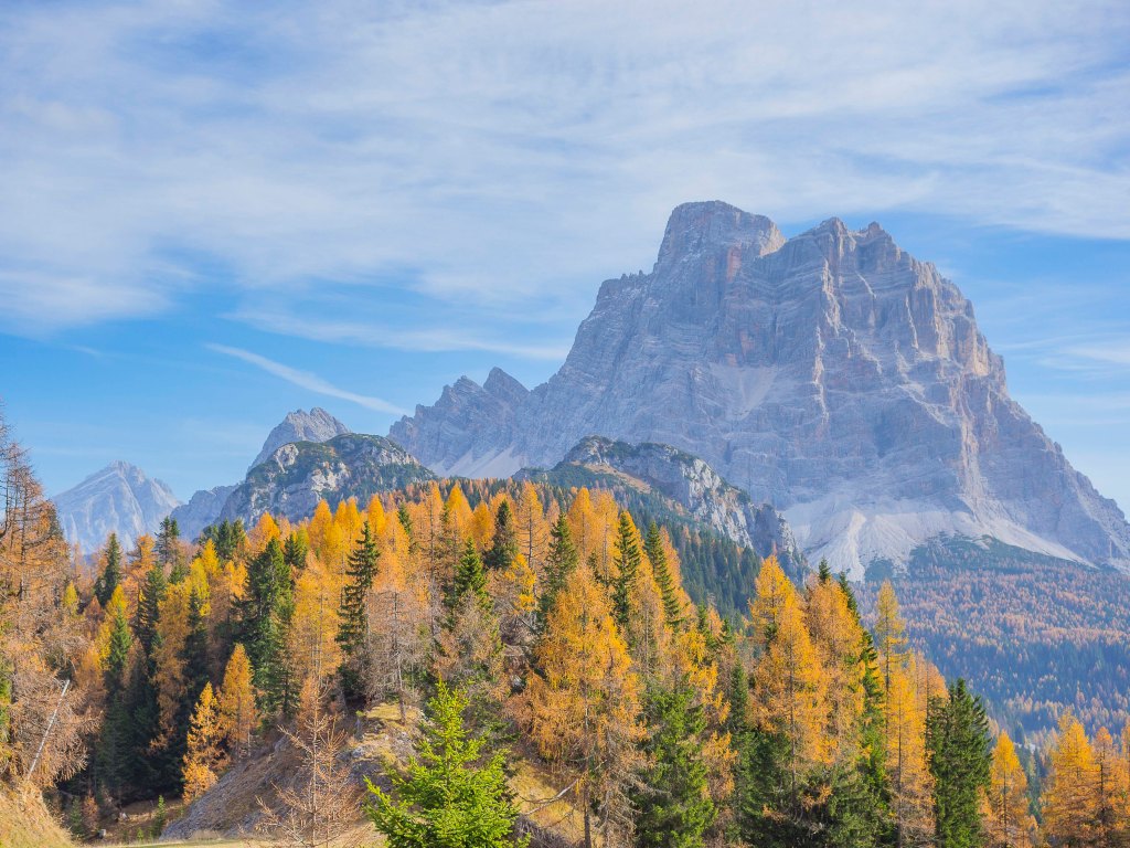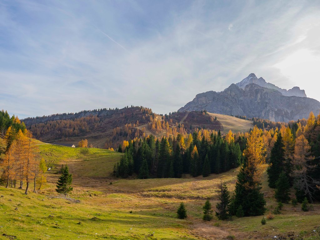 Questa mescolanza di larici e abeti, mai troppo fitti, ci da la possibilità di continuare a guardare in giro, ammirando, dietro di noi il Monte Pelmo (3168 m) che si mette in posa all’interno di una sceneggiatura che in questa stagione è a dir poco artistica.
