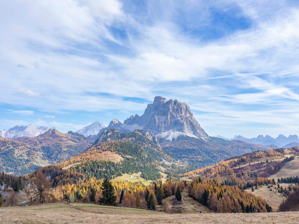 Da qui il protagonista è ancora una volta il Monte Pelmo, con i sui pendii Ovest e Sud che scendono lungo la Val di Zoldo. Ma da qui, spostando un attimo lo sguardo si può scorgere l’Antelao (3264 m) e più verso sinistra si segue la linea delle Rocchette, fino al Becco de Mesdì (2603 m), la Forcella Ambrizzola e lì, verso Ovest, ci si addentra nel mondo del Mondeval.