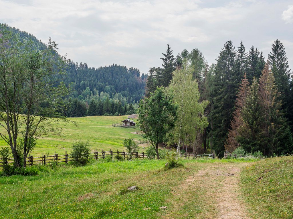 Seguendo la strada asfaltata sottostante la Malga, costeggiamo il prato tenendolo alla nostra sinistra e dopo un po’, troviamo un imbocco da cui un sentiero ci fa rientrare nel bosco, camminando anche un po’ su questo bel prato ampio.