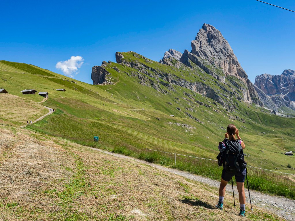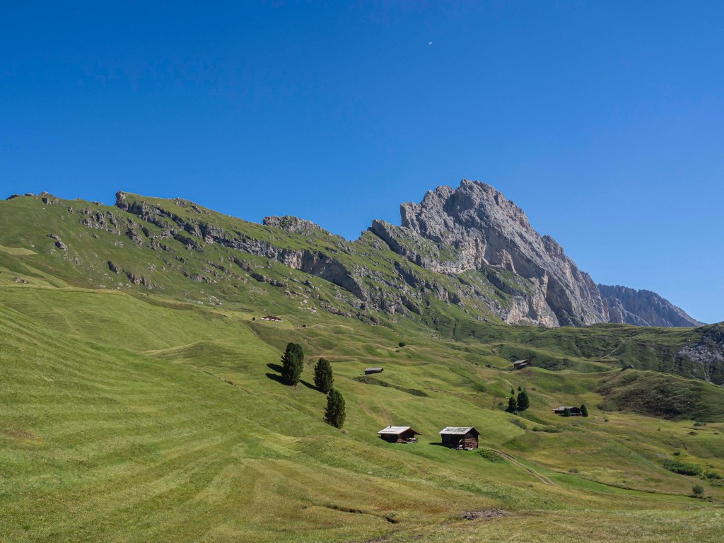 Seguendo il sentiero 2b, iniziamo quindi la seconda metà del nostro trekking, che ci riporterà al punto di partenza, chiudendo il tour ad anello. La passeggiata è per lo più in quota con diversi sali-scendi non impegnativi, sempre costeggiando, a distanza di sicurezza, la cresta del Monte Seceda, che scende a strapiombo sulla Val di Funes. In poco tempo quindi raggiungiamo Forcella Pana e ci rendiamo conto che sotto di noi c’è un’immensa distesa verde tutta puntinata da piccole malghe e tabià.