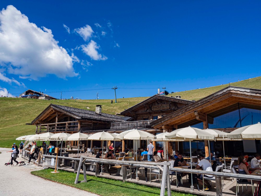 Giungiamo quindi sul posto attorno alle 9 del mattino, il parcheggio è ancora semi vuoto e riusciamo con tutta calma a prepararci per bene, fare una merenda, dato che la colazione è ormai un lontano ricordo, e prendere la funivia che ci conduce subito in quota, a 2107 m, al Rifugio Col Raiser.