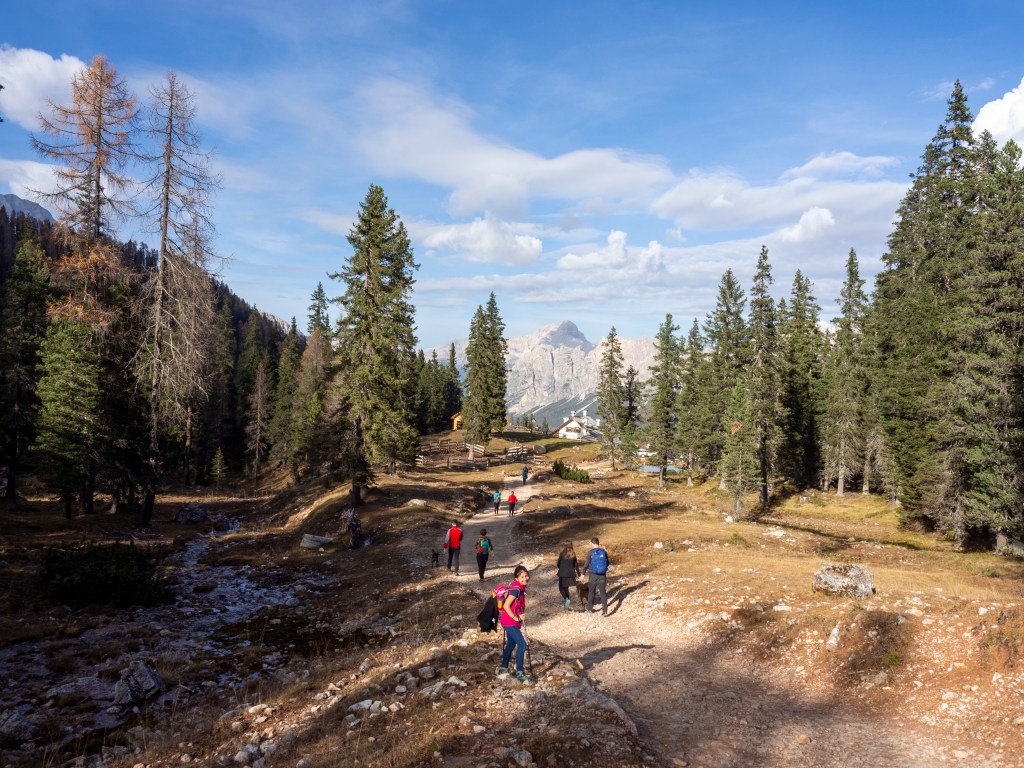 Procediamo, sempre su pendenza pressoché costante ma mai impegnativa, a parte un piccolo tratto (qualche decina di metri), e ammiriamo la bellezza del sottobosco tappezzato dagli aghi dorati caduti dai rami dei larici. In un’oretta di cammino, senza strafare, il bosco inizia a diradarsi e a regalarci i primi scorci con ruscelletti che scorrono attraverso l’erba secca, il verde dei sempreverdi che si mescola col giallo dei larici; così, alla nostra sinistra, inizia a farsi vedere la parete Est della Croda da Lago (2706 m).
